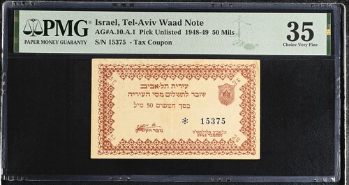 760 veryfine   image1948 Tel Aviv Municipality banknotes 50 mil,  S/N 15375, used, rare banknote. PMG 35 VF.