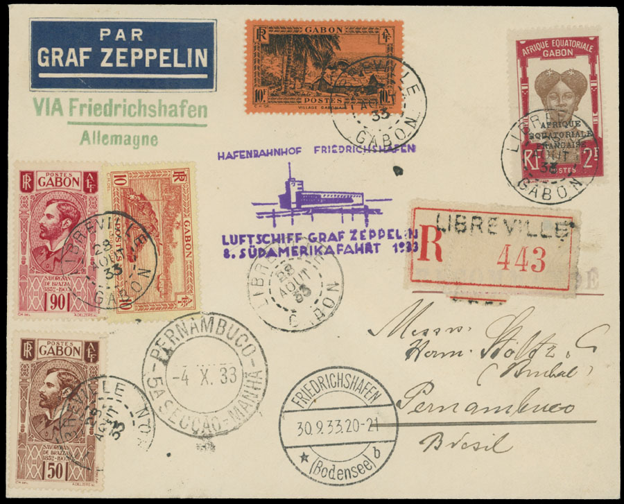 Zeppelin Flight. 1933 (September 30 - October 4), 8th South America flight registered cover to Brazil, franked by five stamps, including overprinted definitive of 2fr carmine and brown and 10fr black on orange paper issued in 1932, cancelled by Libreville ''28.AOUT.33'' ds, Friedrichshafen ''30.9.33'' connection and violet flight markings, Pernambuco ''4.X.33'' arrival ds, mostly VF, Sieger #235, C.v. €1,000 without a premium for postage, Est. $1,000-$1,200....