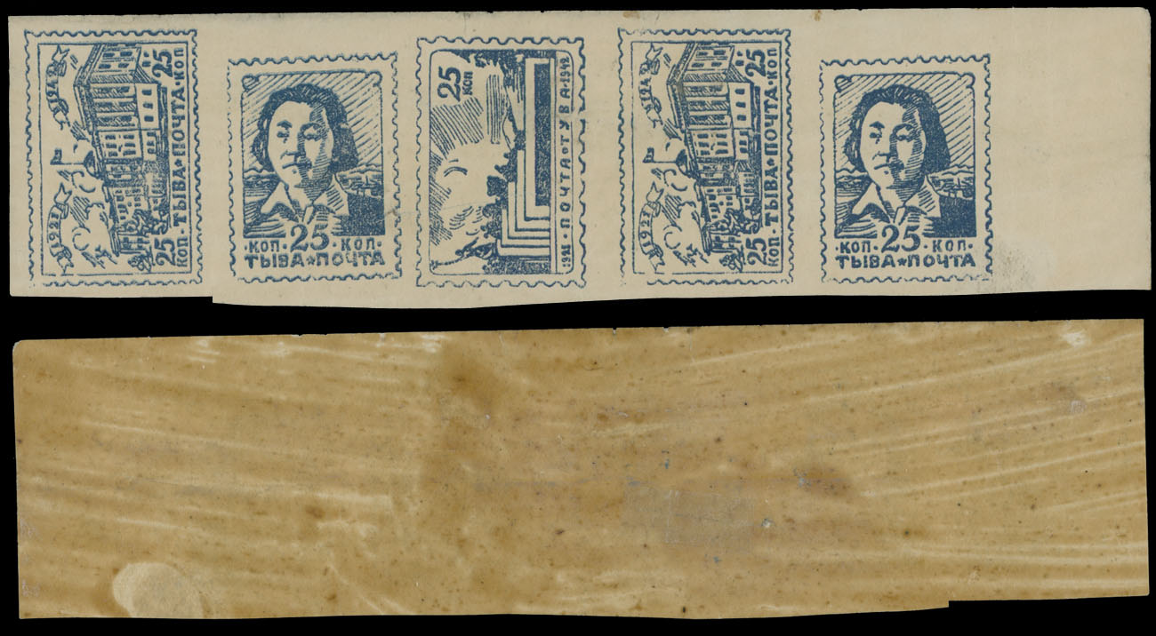 1942, 21st Anniversary of Independence, 25k blue, right sheet margin horizontal se-tenant strip of five, consists of two of Government House, two of Tuvan Woman and one of Exhibition Hall, full original gum usually rough yellow brown gum placed by a brush, NH, VF and with high probability unique strip, V. Ustinovsky is mentioned this strip, but not illustrated it, Est. $20,000-$25,000....