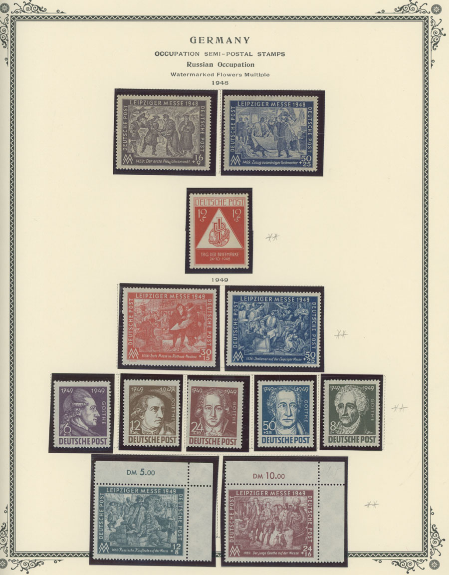 Collection on Scott Pages. 1945-48, several hundred mint stamps and 7 souvenir sheets, starting by general Soviet Zone issues with Goethe souvenir sheet, the Berlin set of 1945 and issues for Mecklenburg-Vorpommern with No.12NB1-3