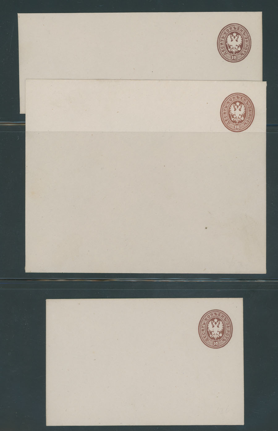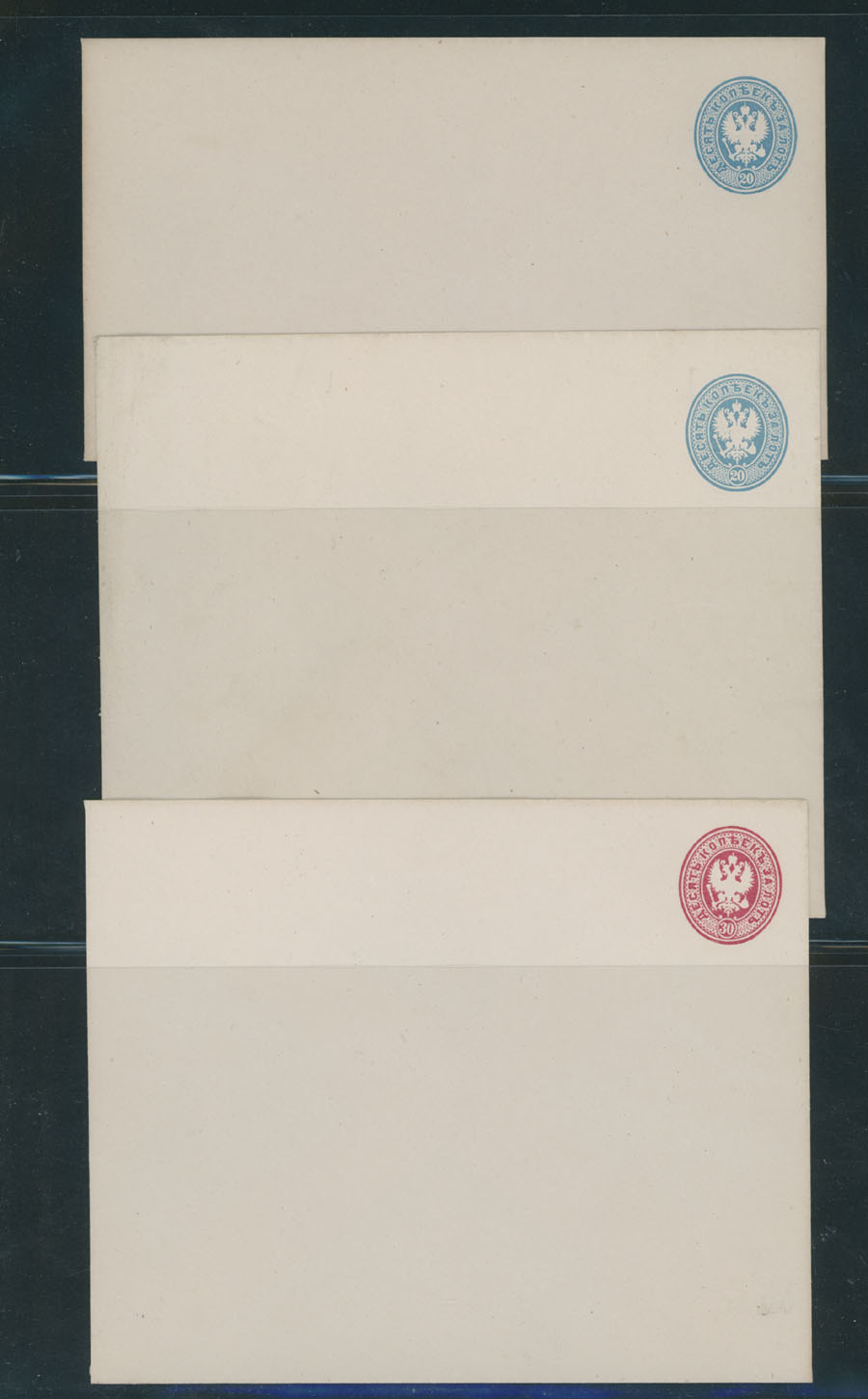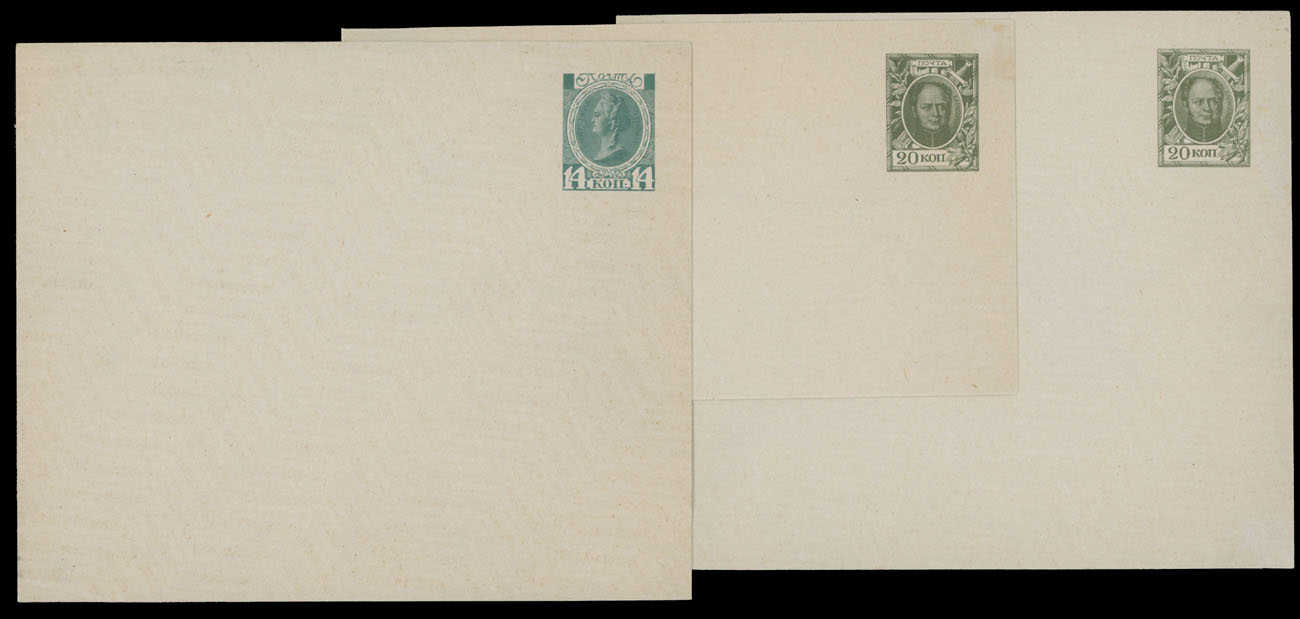 Romanov Dynasty issues. 1913, 10 envelopes of 3k, 7k, 10k, 14k and 20k, two sizes of each, 4 stationery cards of 3k and 4k, including two unsevered reply cards, three letter cards of 3k, 7k and 10k, all are fresh, unused and VF,