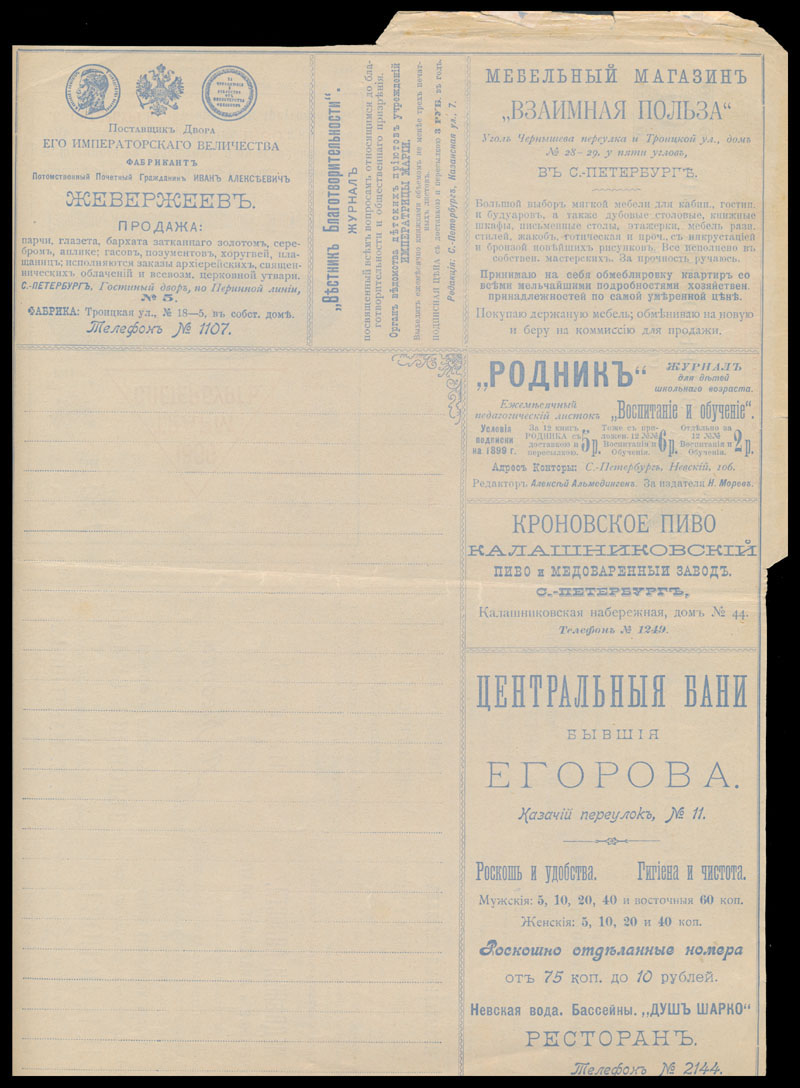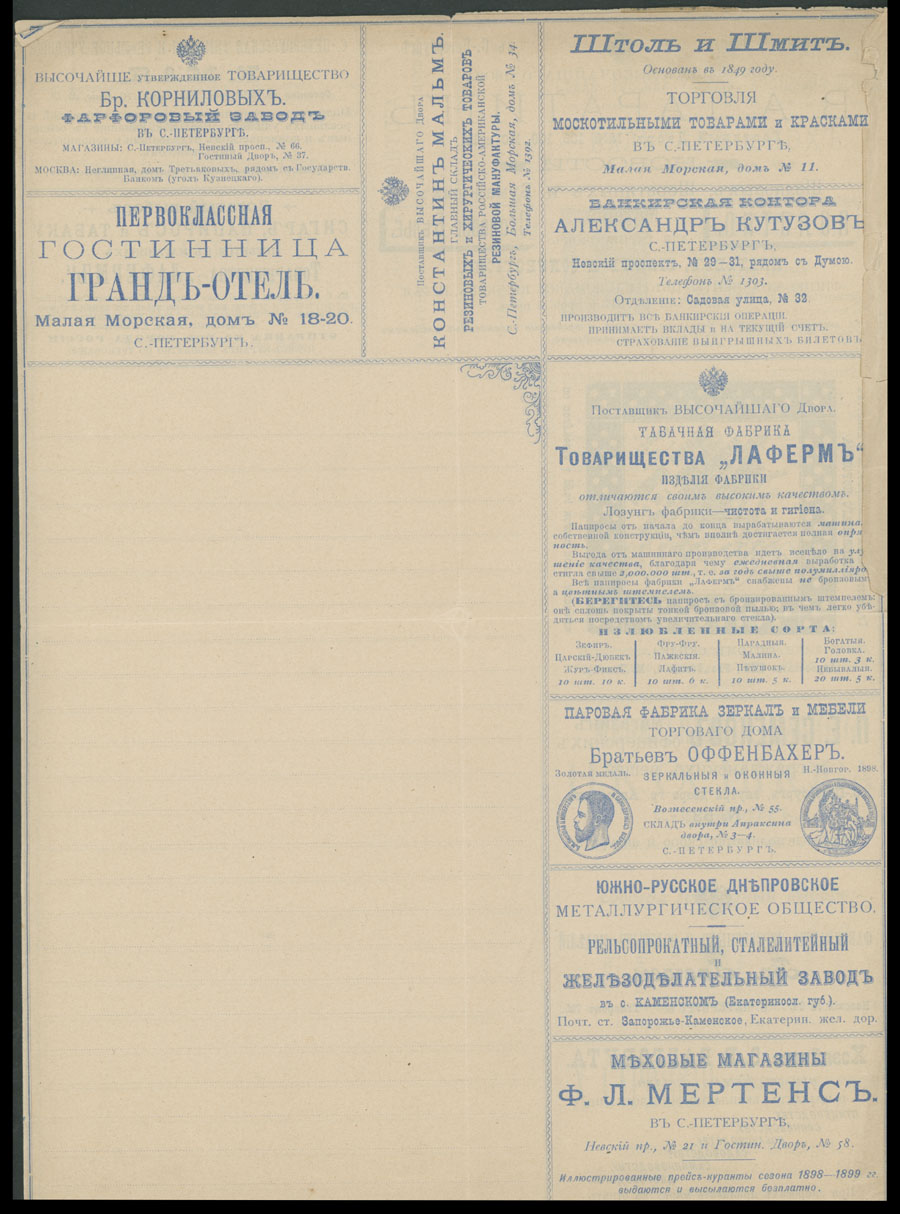 Advertising Letter-Sheets. 1898, 7k blue, unused letter-sheet of series 1, printed in St. Petersburg, containing 32 various advertisements inside and on reverse, usual folds, fresh and VF, Est. $700-$800 (Image) (Image2)