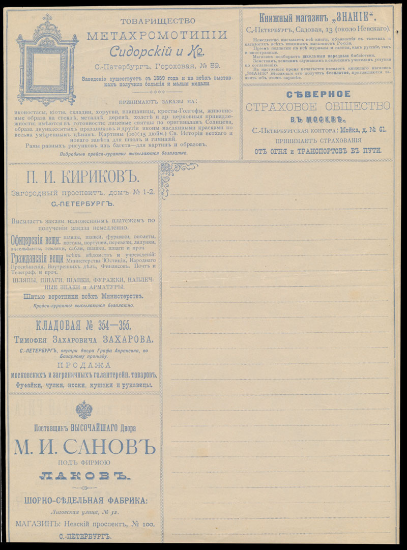Advertising Letter-Sheets. 1898, 7k blue, unused letter-sheet of series 4, printed in St. Petersburg, containing 24 various advertisements inside and on reverse, usual folds, mostly VF, Est. $600- $700 (Image) (Image2)