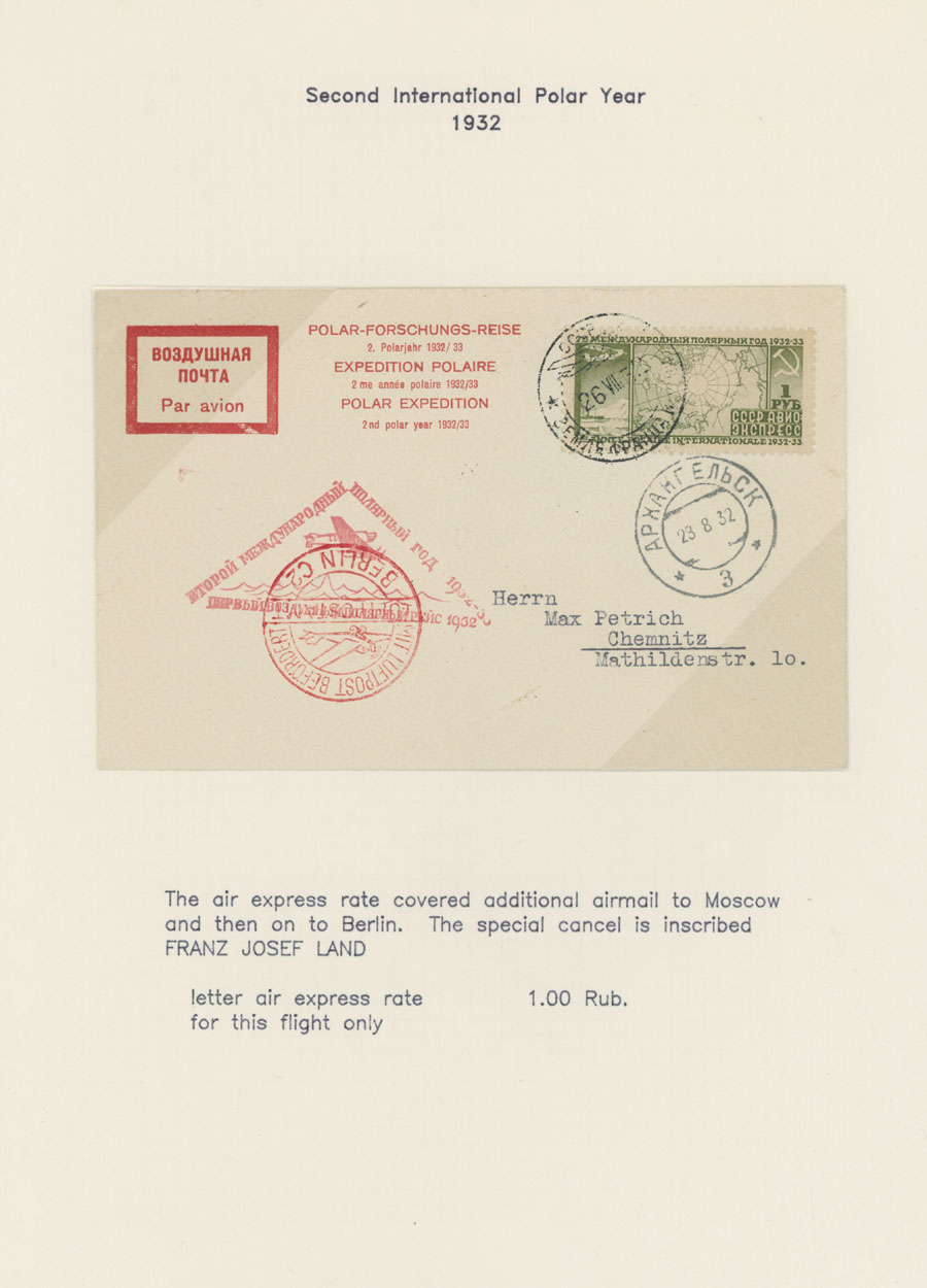 ''25.VII.31'' in Leningrad with Ice-Breaker ''27.VII.31'' receiver, German confirmation cachet and all appropriate markings, VF, Sieger #120Ba, Bb, Est. $300-$350