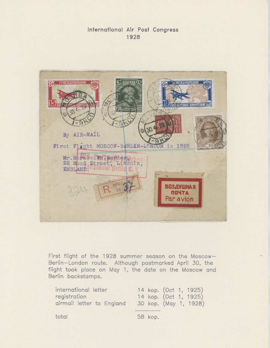 Conference (#C10-11), two covers delivered on line Leningrad-Berlin with special line cancellation, cover to Paris franked with 1r imperf from Aviation Exhibition souvenir sheet and more, all arranged on pages from a Collection, minor flaws