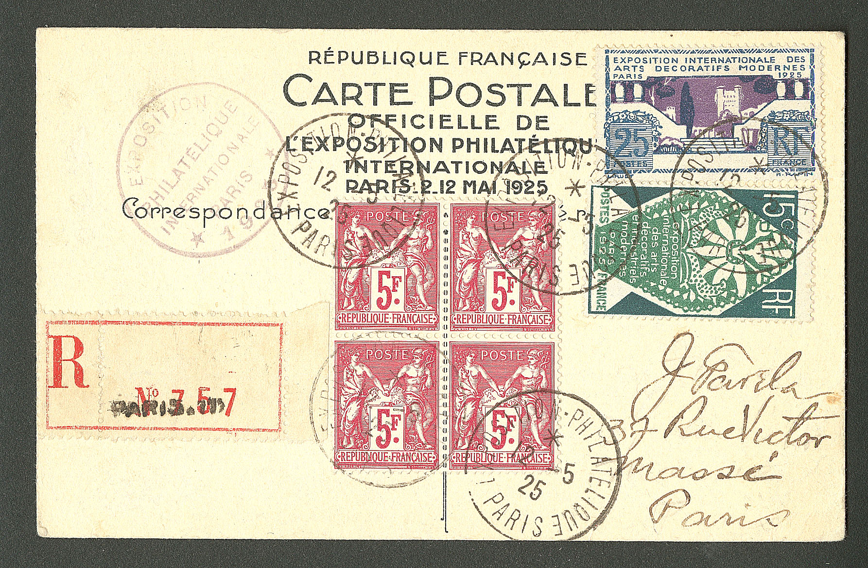 Lettre. Paris. Nos 216 bloc de quatre + 211 + 213, obl de l'Exposition sur CTS recommandée. - TB (Image)