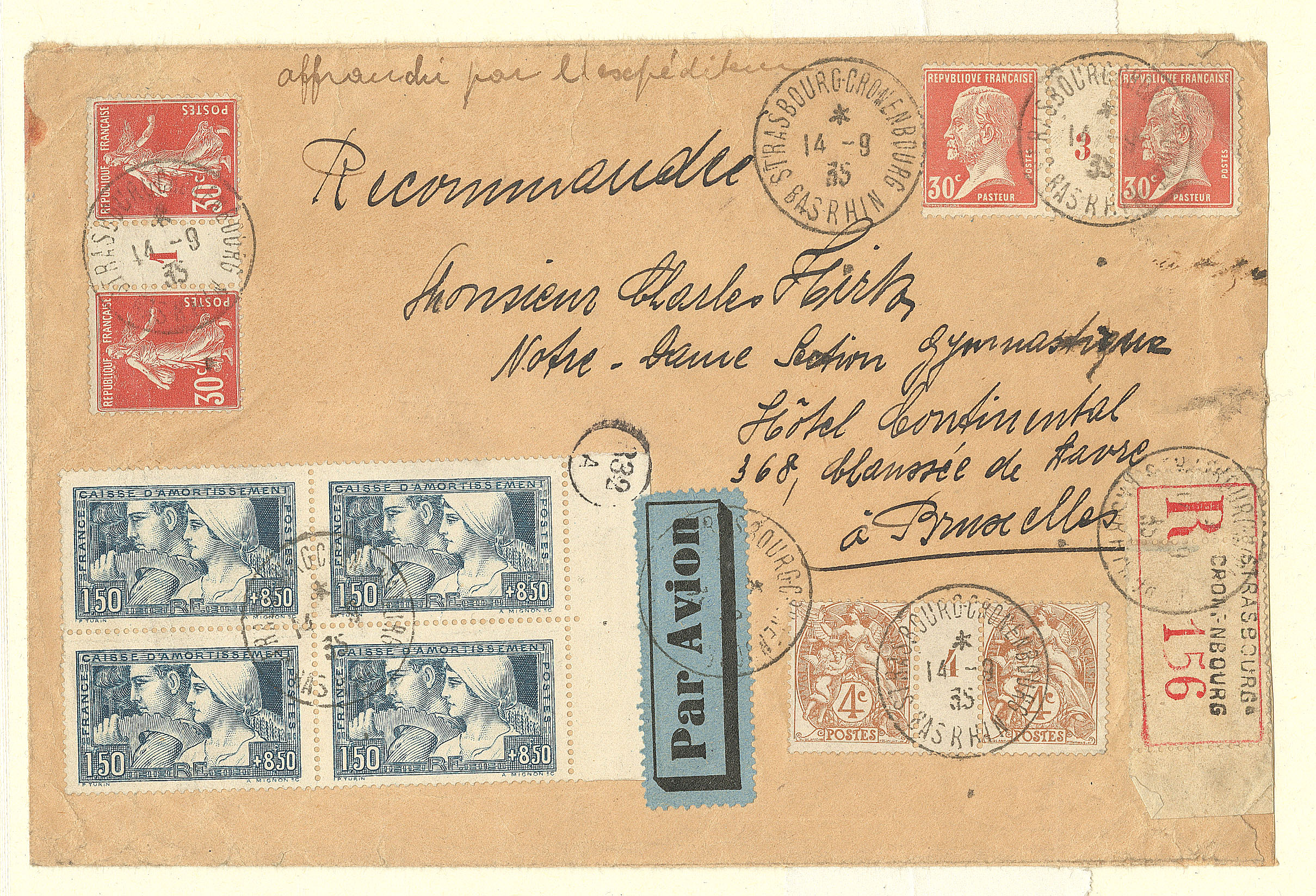 Lettre. Caisse d'amortissement. Le Travail. Nos 252(3) + 252a en bloc de quatre + 110 paire mill. 4 + 160 paire mill. 1 + 173 paire mill. 3, sur enveloppe recommandée pour Bruxelles. - TB (Image)