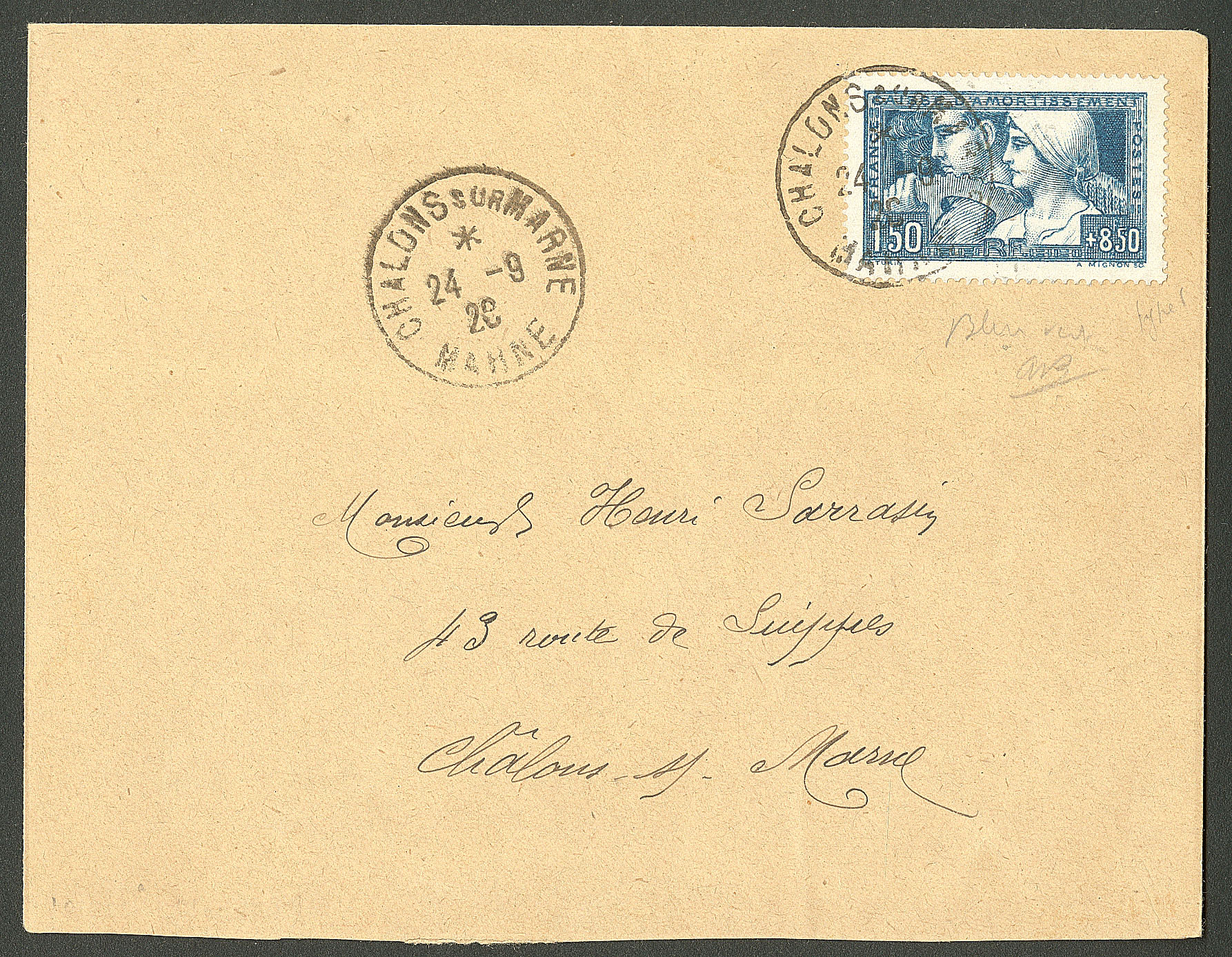Lettre. Caisse d'amortissement. Le Travail. Bleu vert. No 252c, sur enveloppe de Châlons 24.9.28. - TB (Image)