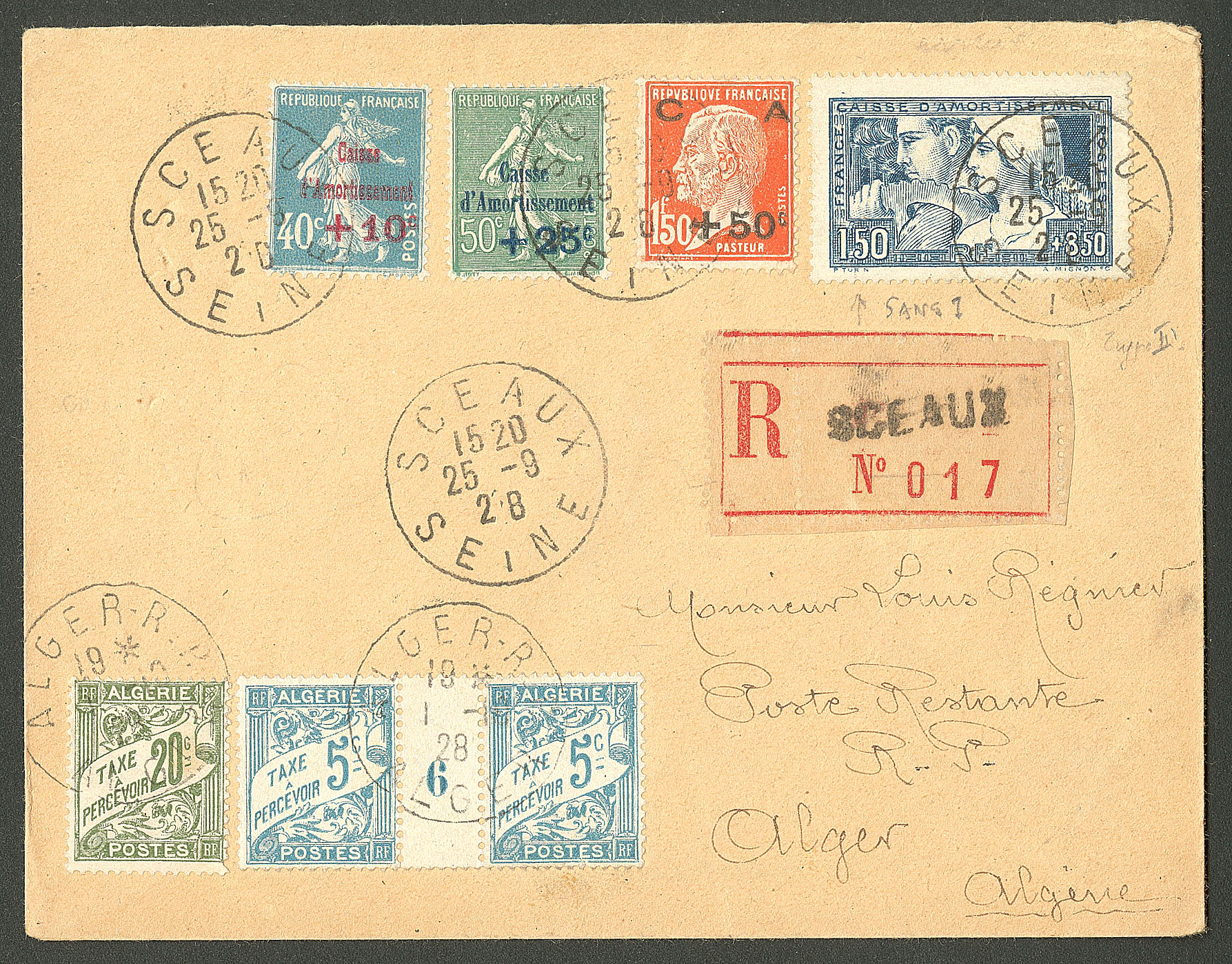 Lettre. Caisse d'amortissement. Le Travail. Variété "TUR N". Nos 252e + 246 à 248 + Algérie Taxe 1A paire mill 6 + 3, sur enveloppe recommandée de Sceaux pour Alger. - TB