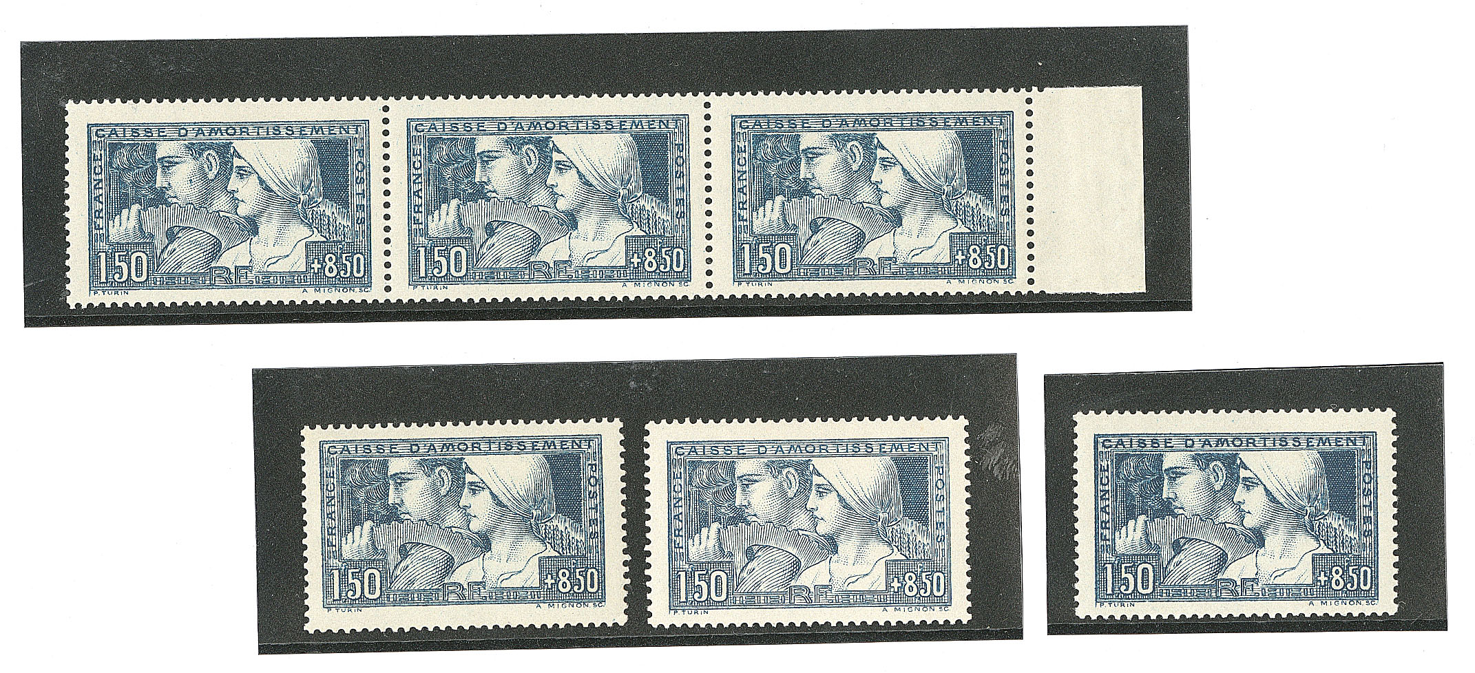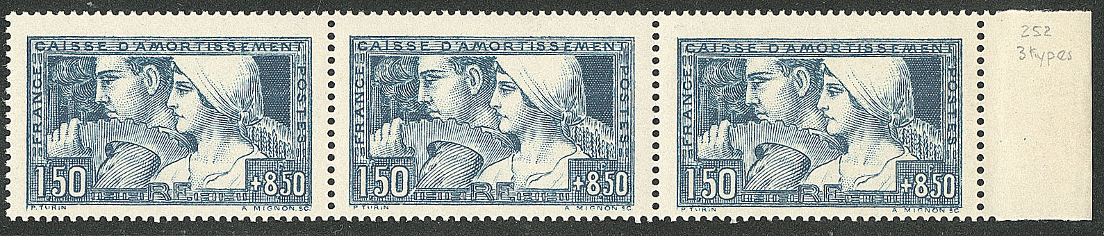 Caisse d'amortissement. Le Travail. Les trois types se tenant. Nos 252 + 252a + 252b en bande de trois bdf, + 252(2) et 252b. - TB (cote Yvert: 1540€) (Image)