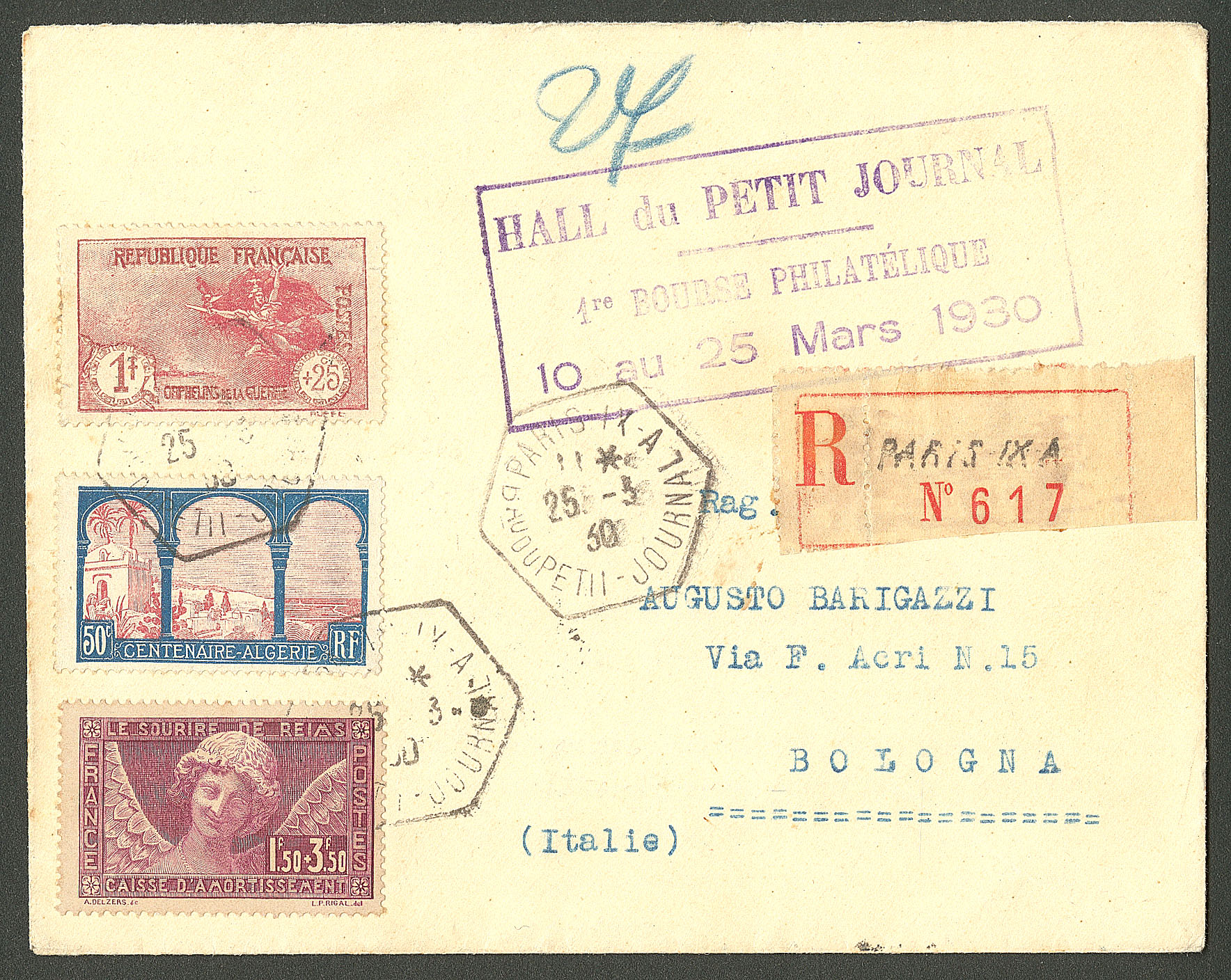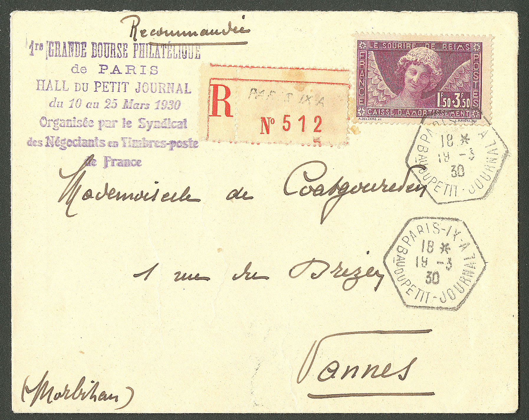Lettre. Caisse d'amortissement. Sourire de Reims. Nos 256 + 231 + 263, sur enveloppe "1re bourse philatélique" 10/25 mars 30, recommandée pour l'Italie. - TB (Image)
