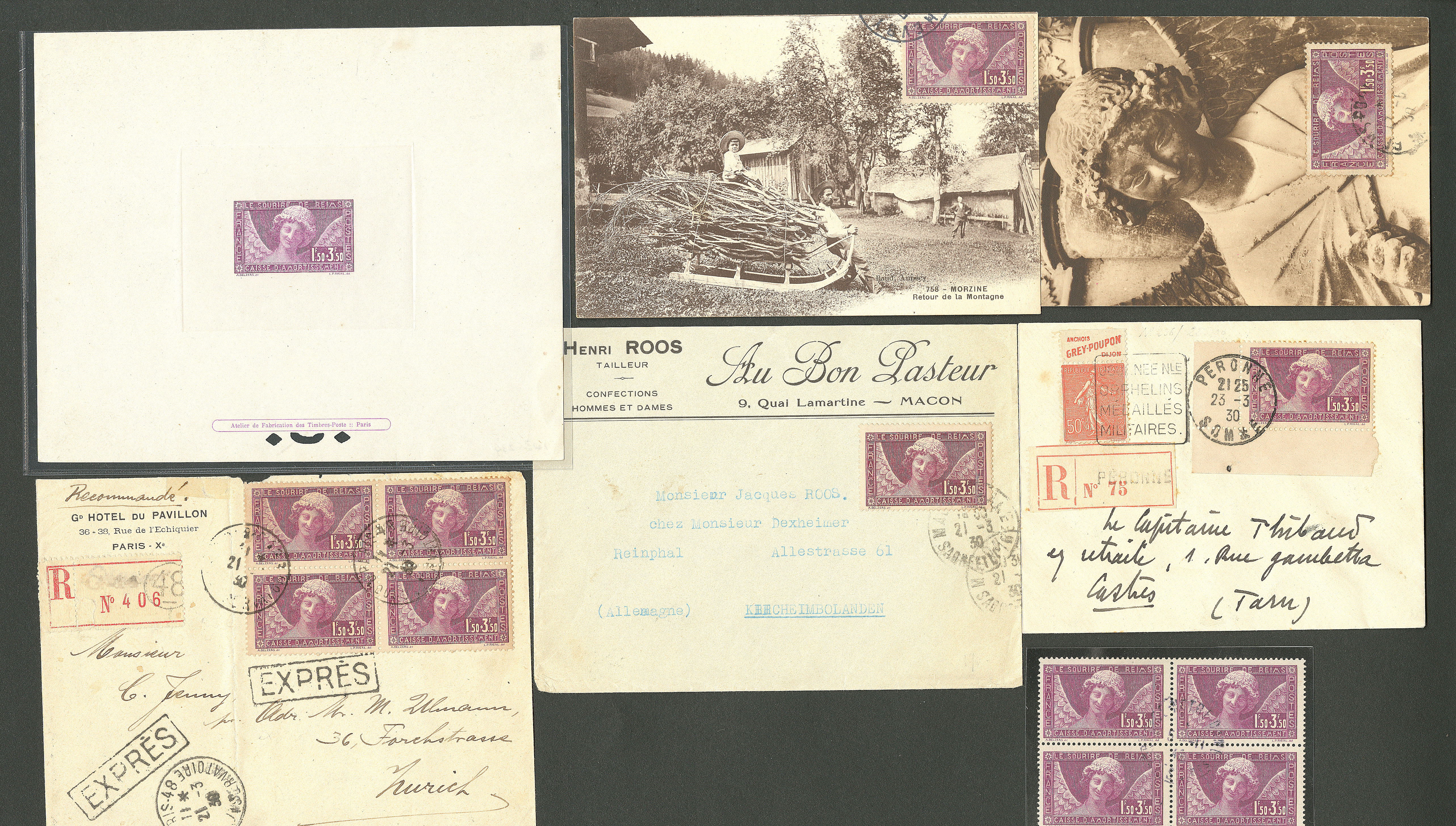 Lettre. Caisse d'amortissement. Sourire de Reims. No 256 (bloc de quatre + 4ex), sur 2 CP et 3 enveloppes dont 2 recommandées, + 1 épreuve sans rabat et fortes charnières + bloc de quatre obl. - TB (Image)