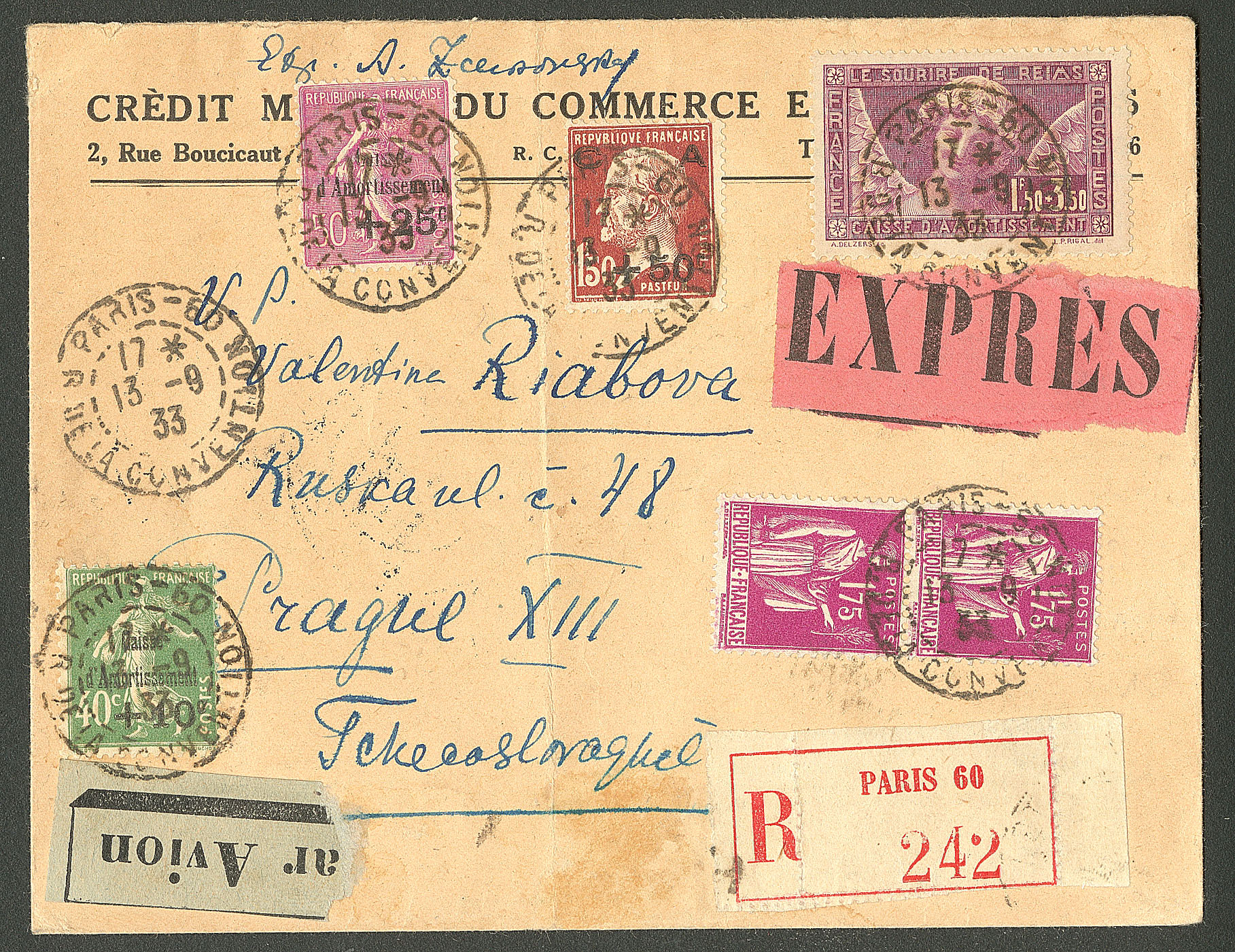 Lettre. Caisse d'amortissement. Sourire de Reims. Nos 256 + 253 à 255 + 289 paire, sur enveloppe recommandée pour Prague. - TB (Image)