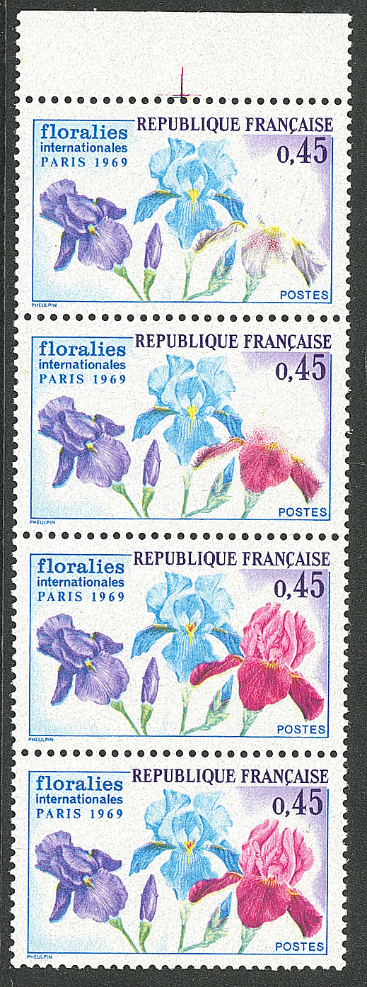 Floralies internationales. No 1597b, un ex fleur rouge presque absente tenant à un ex sans le rouge tenant à deux ordinaires et formant bande de quatre verticale. - TB. - R (N°SM)