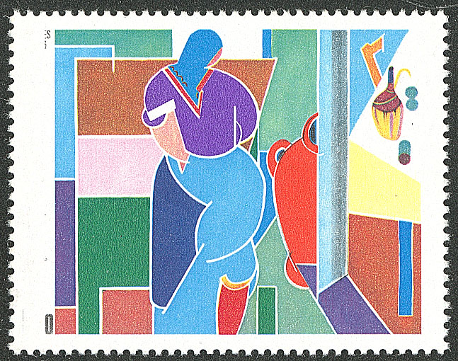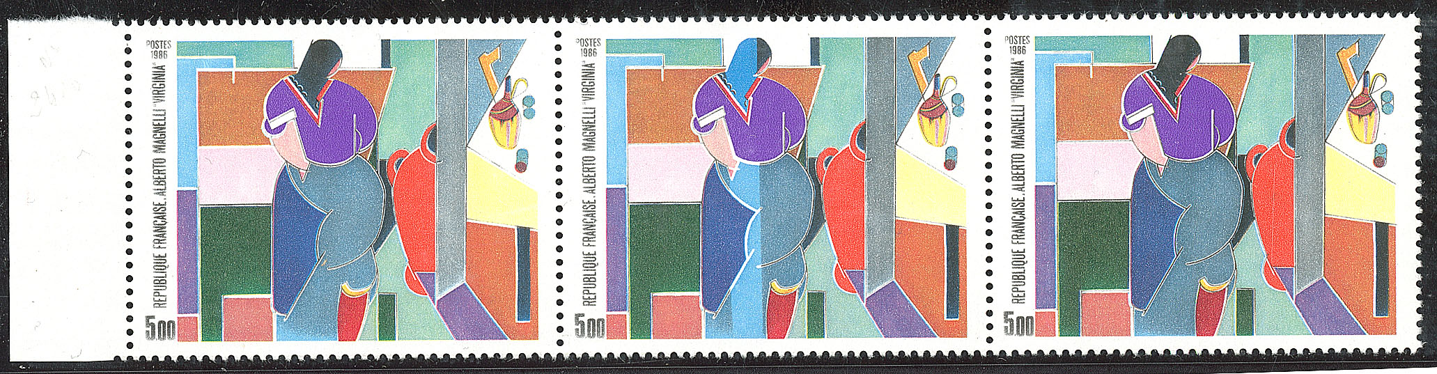 Magnelli. Variété. No 2414, bande de trois bdf dont l'ex central avec large bande bleue sur le personnage. - TB (Image)