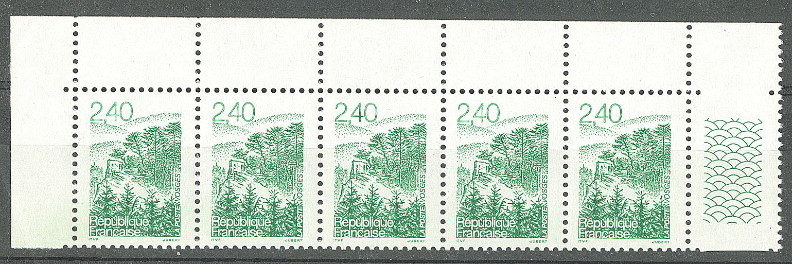 Les Vosges, sans phospho. No 2950a, bande de trois sans phospho tenant à une paire phospho, formant bande de cinq haut de feuille. - TB (Image)
