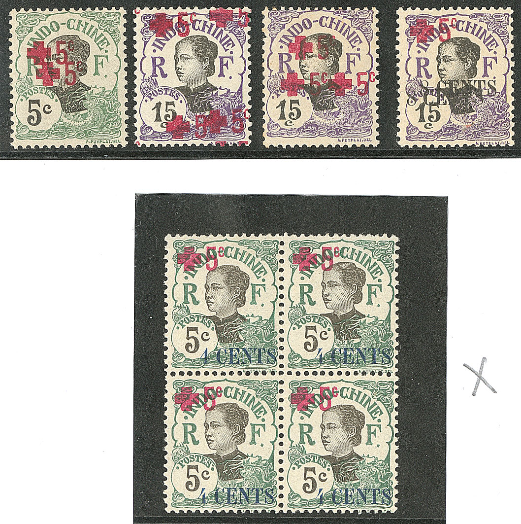 INDOCHINE. * Variétés. Nos 66a, 68a, 68b, 69aa bloc de quatre, 71a. - TB (cote Yvert : 1400€) (Image)