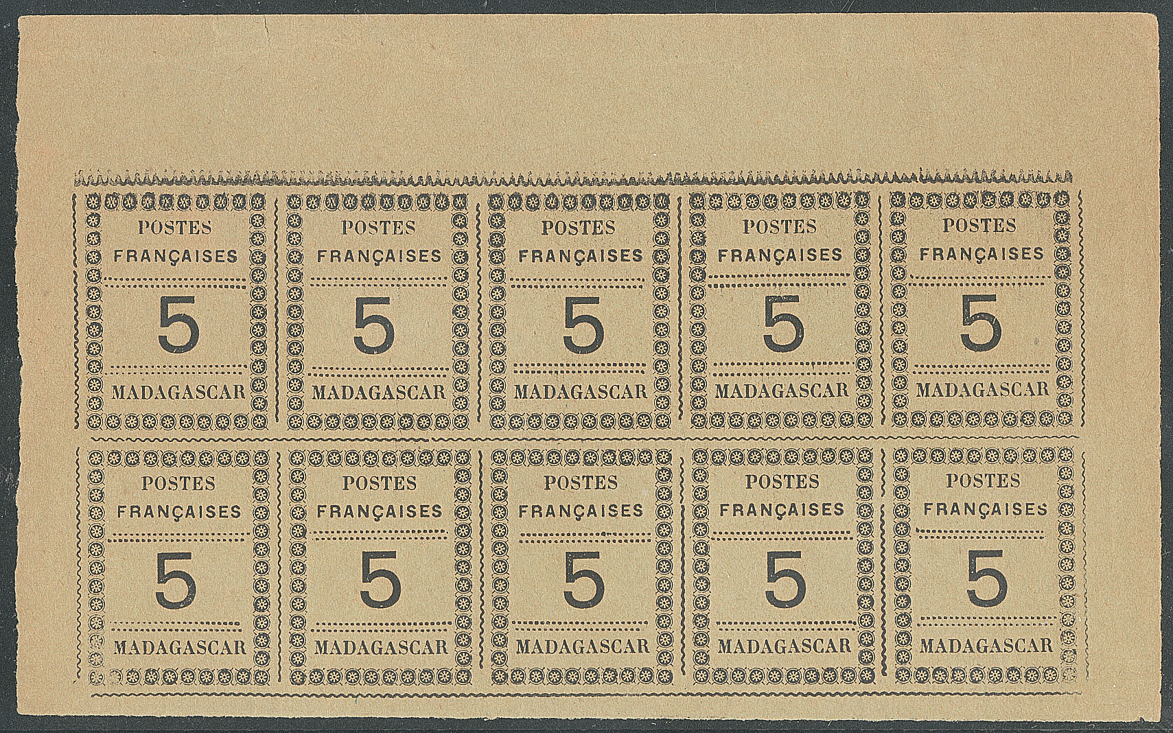 MADAGASCAR. (*) No 8a, feuillet de dix encadré, petite fente en bordure en haut mais très loin des timbres. - TB (cote Yvert : 4500€) (Image) (Image2)