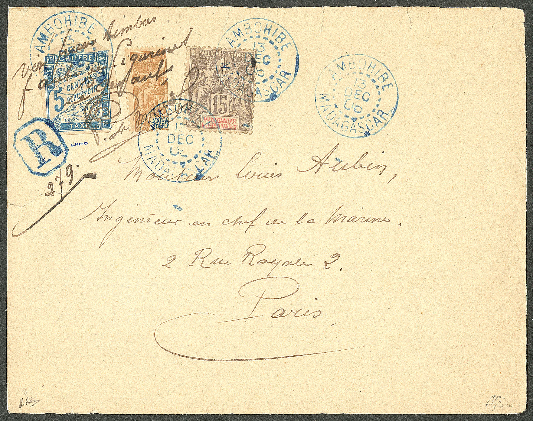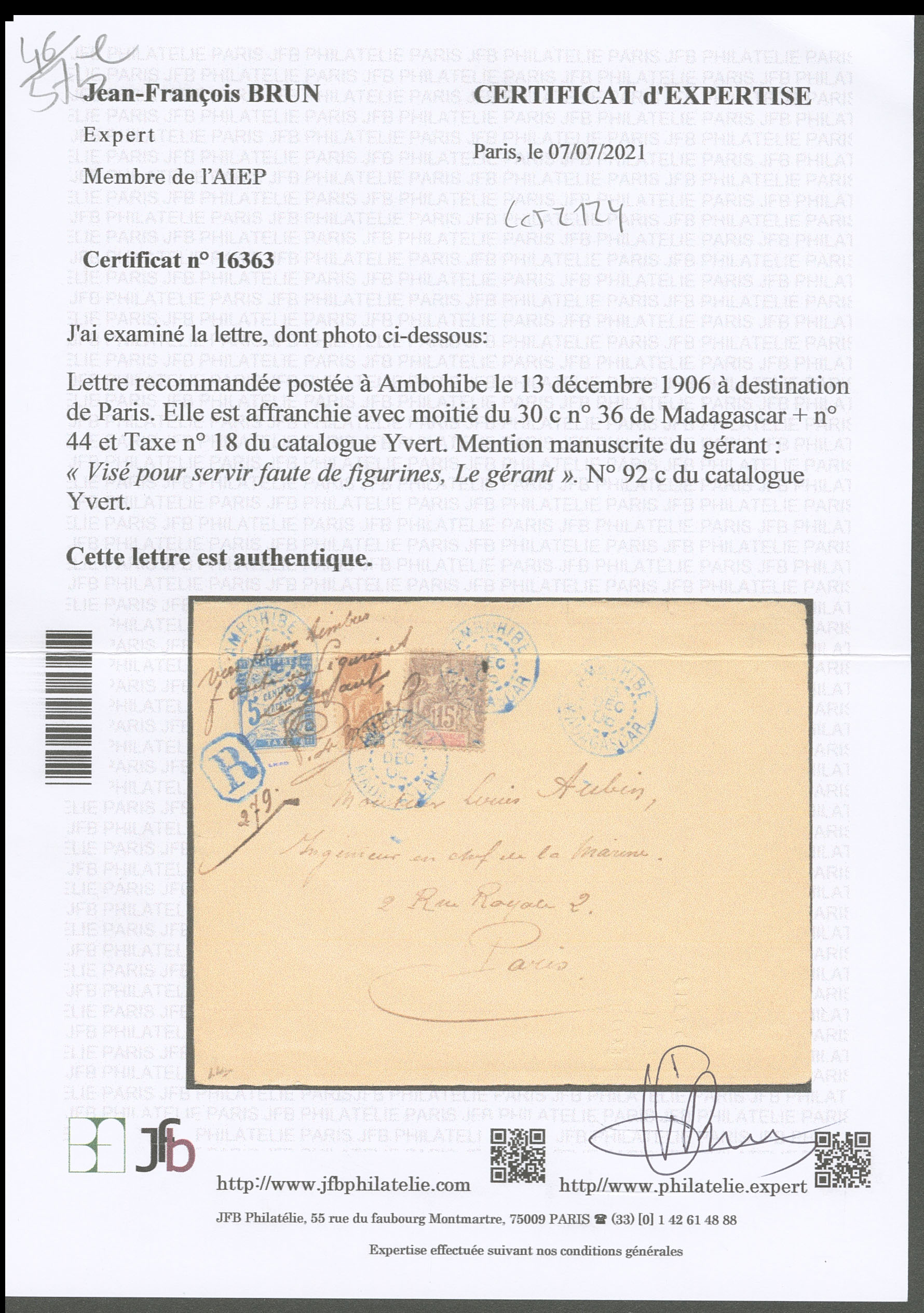 MADAGASCAR. Lettre. Coupé d'Ambohibe. No 92C (moitié de 30c N°36) + taxe CG 18 + Poste 44, avec mention manuscrite du gérant "Visé pour timbres/faute de figurines" et signature, sur enveloppe recommandée du 13 déc 1906, pour Paris, très jolie