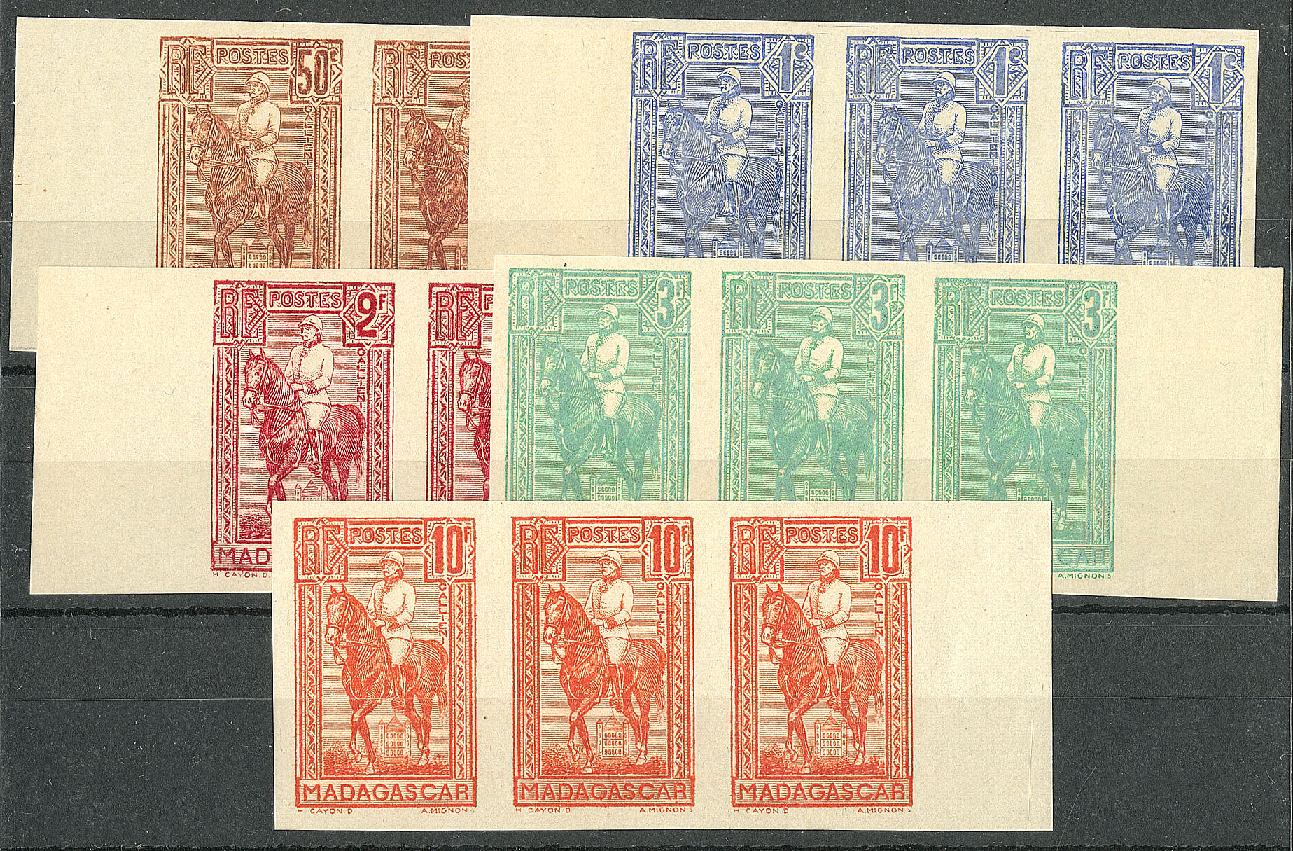 MADAGASCAR. ** Non dentelé. Nos 183 à 187, en bande de trois bdf, infimes adhérences sinon TB (cote Yvert : 1425€) (Image)