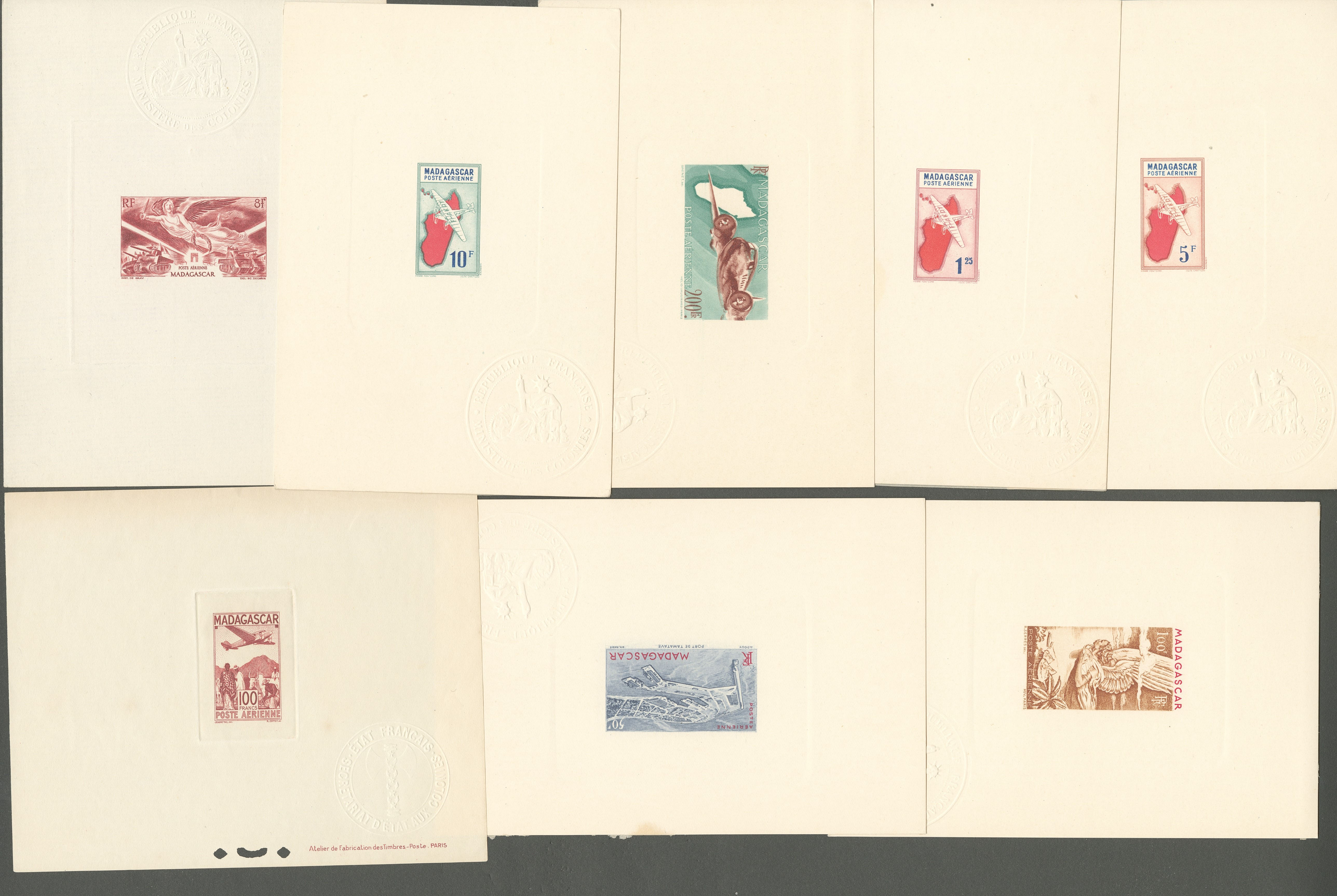 MADAGASCAR. (*) Poste aérienne. Epreuves. Nos 2, 33, 36, 62, 63, 64, 64B, 65, avec cachet Ministère des Colonies. - TB (Image)
