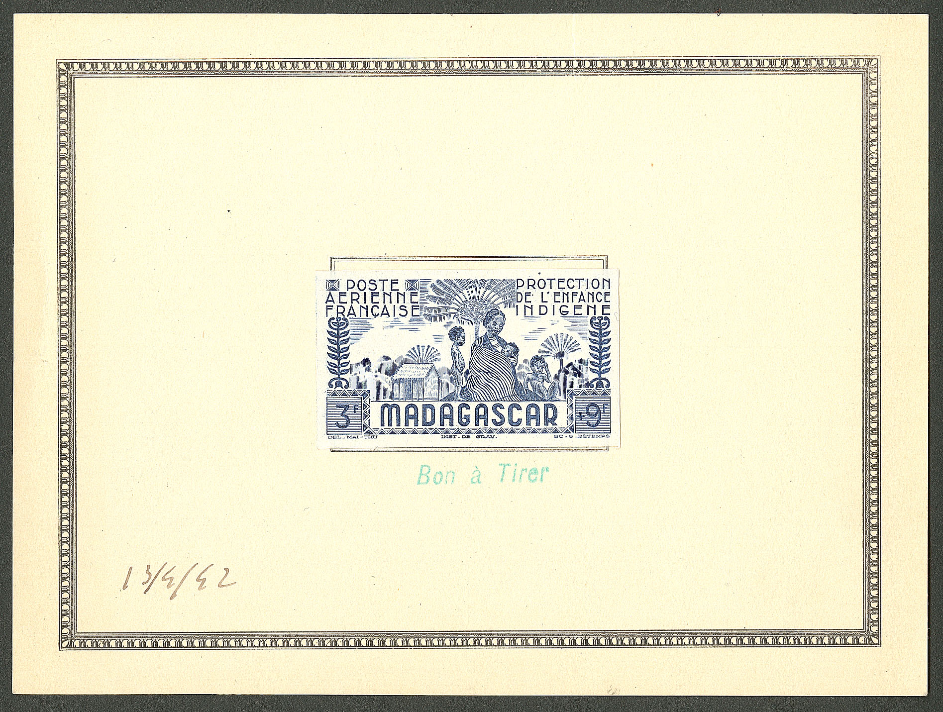 MADAGASCAR. (*) Poste aérienne. Essai non dentelé en bleu No 43, collé sur carton "Bon à tirer" et date manuscrite 13/4/42. - TB. - R (Image)