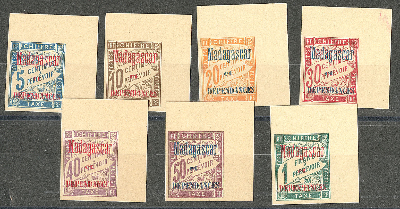 MADAGASCAR. (*) Taxe. Tirage sur bristol. Nos 1 à 7, tous cdf. - TB. - R (cote Yvert : 1300€) (Image)