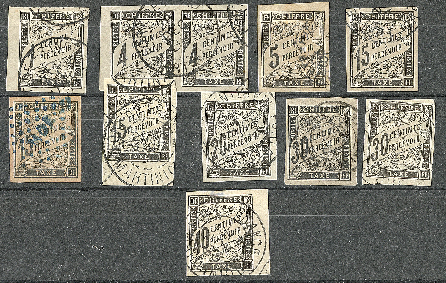 MARTINIQUE. Précurseurs. Taxe. 11 ex entre les CG 1 et CG 10, majorité Fort de France. - TB (cote Yvert : 345€) (Image)