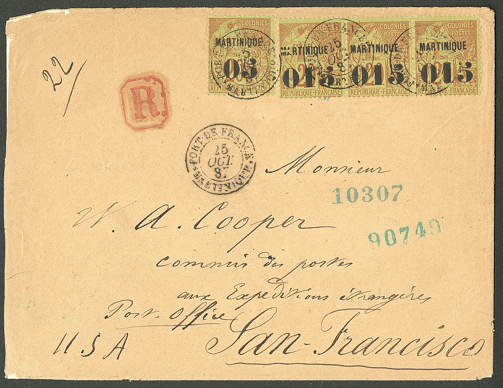 MARTINIQUE. Lettre. Nos 6 bande de trois + 4, obl cad Fort de France oct 87, sur enveloppe recommandée pour San Francisco. - TB (Image)