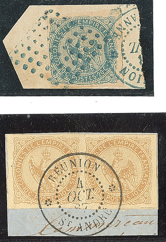 2390 imageCOLONIES FRANCAISES. REUNION. Précurseurs. CG 3 paire obl cad "St André", 4 obl losange bleu. - TB (cote Yvert : 105€) (Image)
