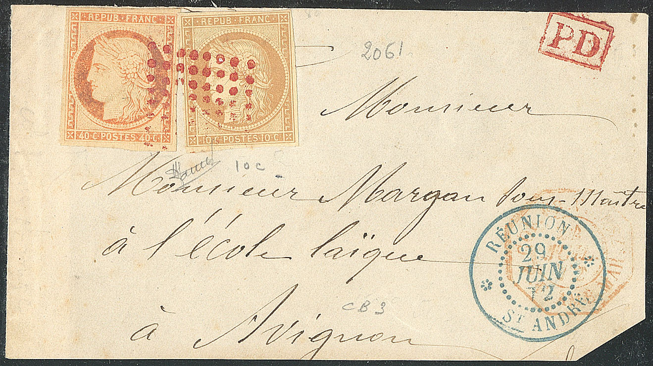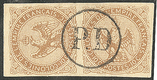 2391 imageCOLONIES FRANCAISES. REUNION. Précurseurs. Timbre couché. CG 3a, paire obl "PD" rond, superbe (cote Yvert : 790€) (Image)