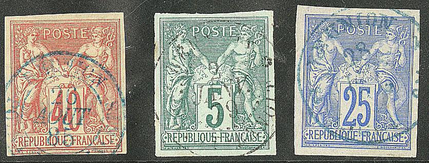 2398 imageCOLONIES FRANCAISES. REUNION. Précurseurs. CG 27 obl "Pointe des Galets", 31 obl "St Benoit" et 36 obl "Ligne SV" bleu. - TB (Image)