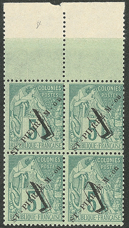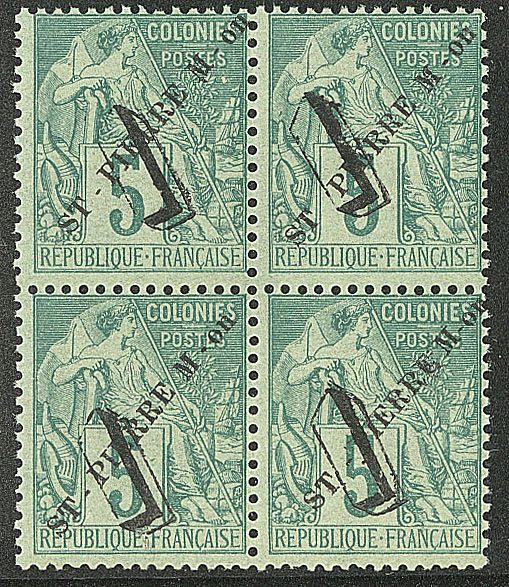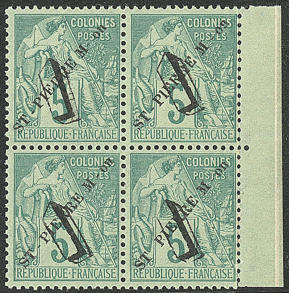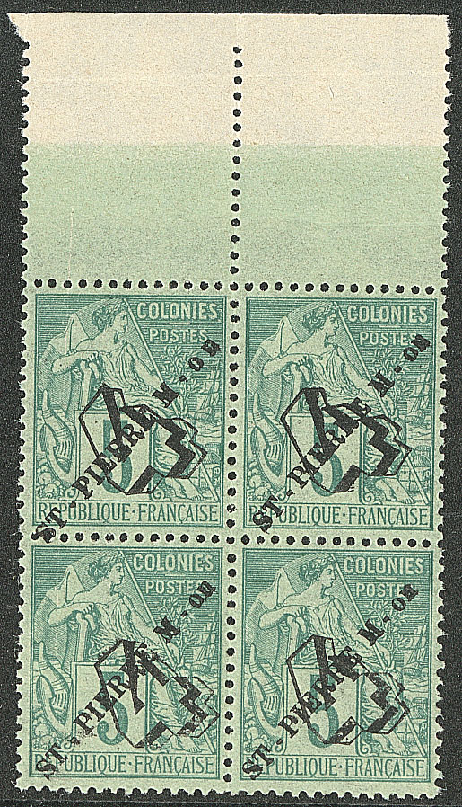 SAINT-PIERRE-ET-MIQUELON. ** Sans tiret après "M". No 45d (case 50), tenant à normaux dans un bloc de quatre bdf. - TB (cote Yvert : 845€) (Image)