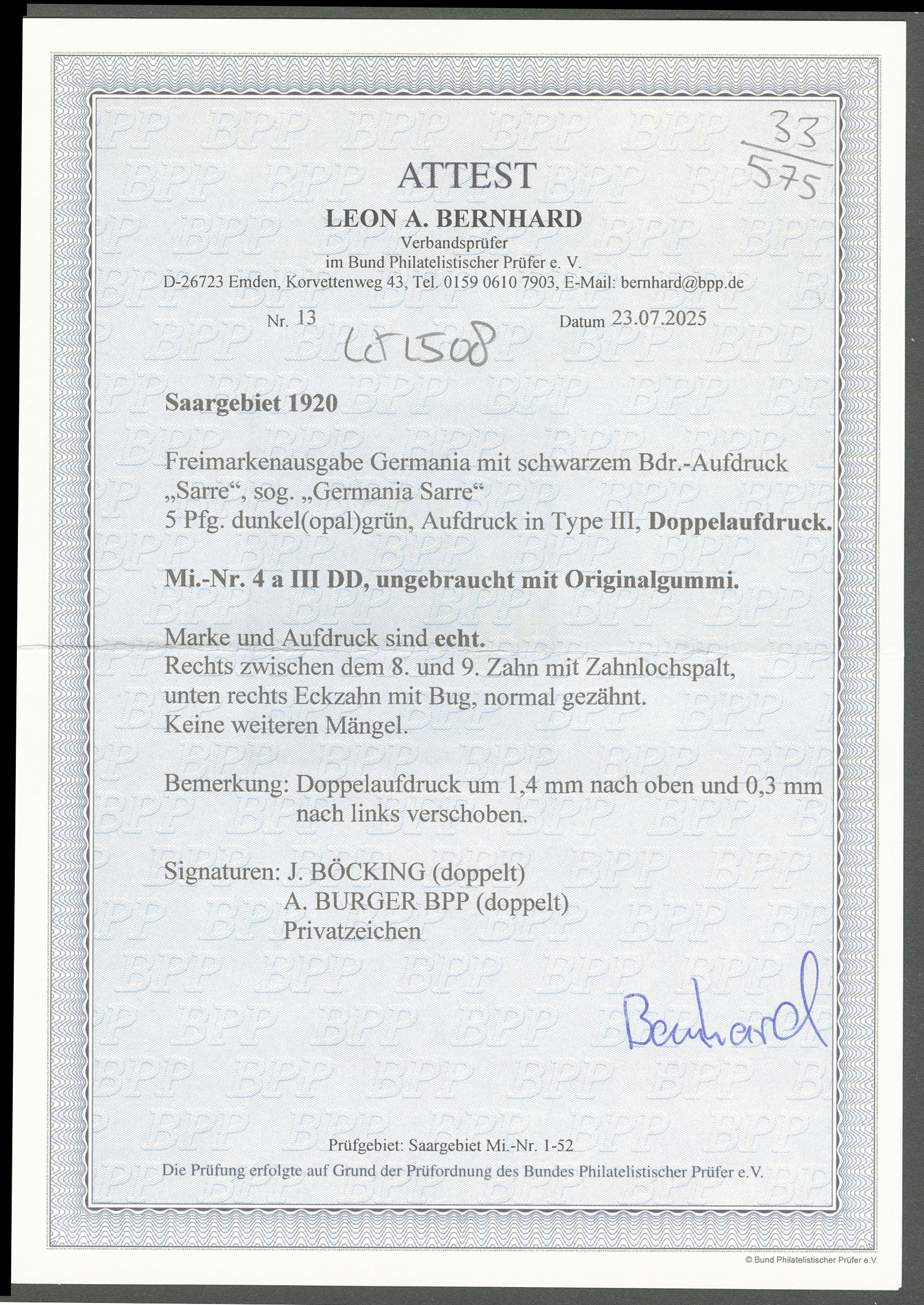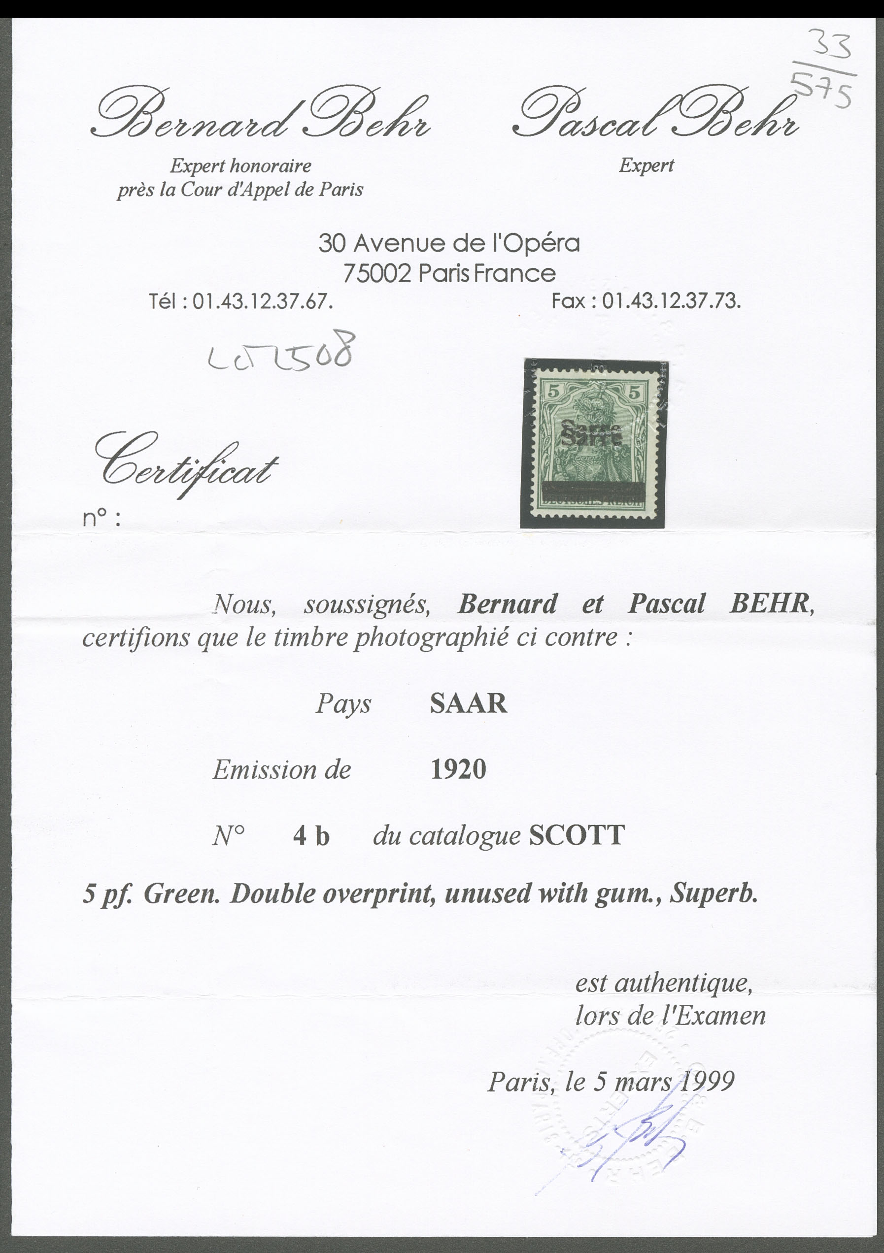 SARRE . * 3e tirage. Double surcharge. No 4Ba. - TB (cote Yvert : 1150€) (Image)