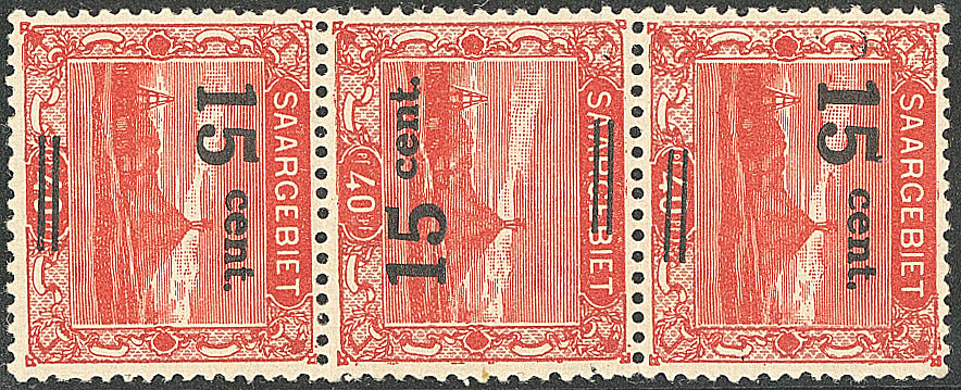 SARRE . ** Surcharge seule tête-bêche. No 72c, def, au centre d'une bande de trois verticale, TB d'aspect (cote Yvert : 2200€) (Image)