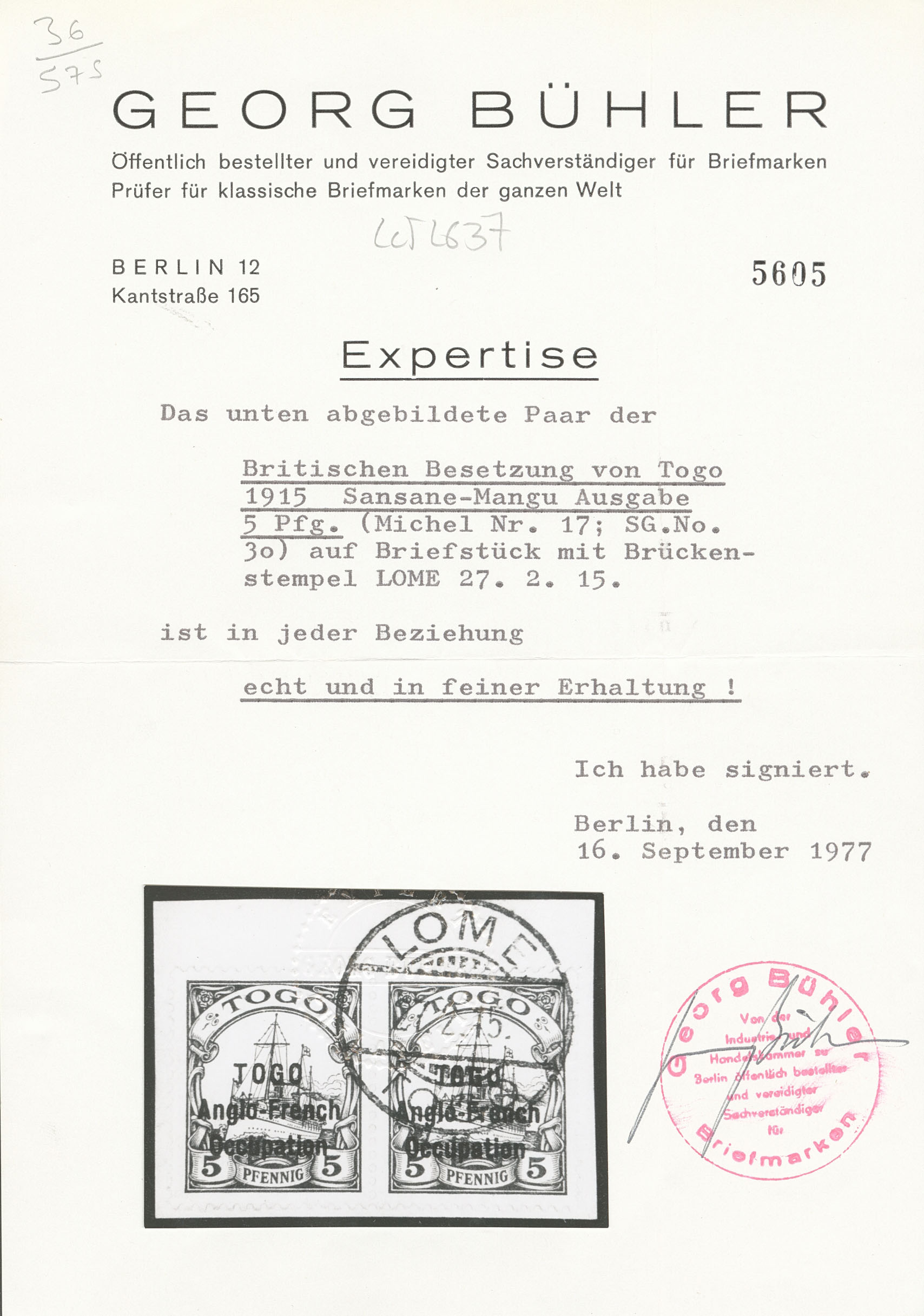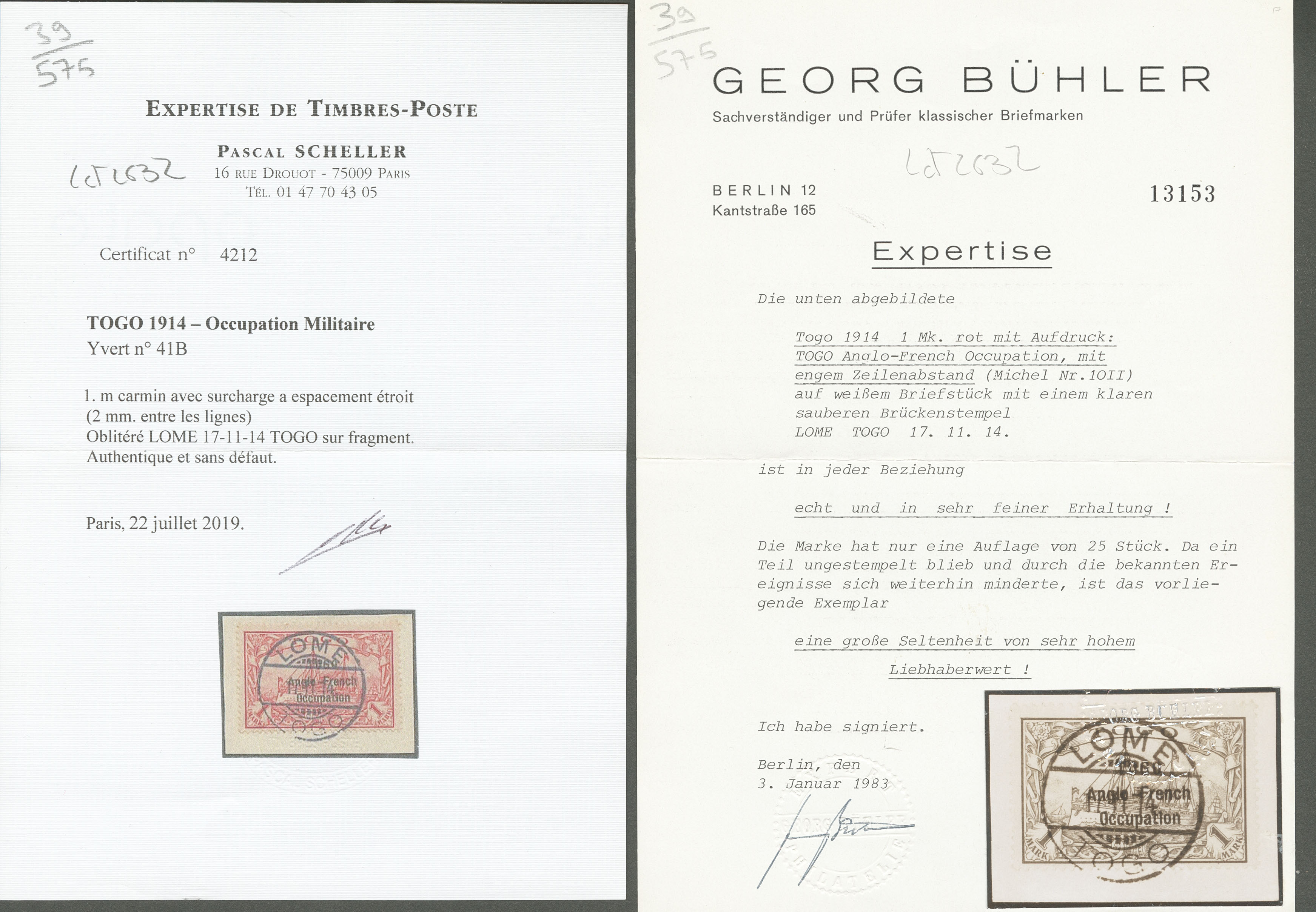 TOGO. Surcharge II. No 41A, obl Lomé 17.11.14 sur support. - TB. - RRR (certificats Bühler et Scheller) (cote Yvert : 9650€) (Image) (Image2)