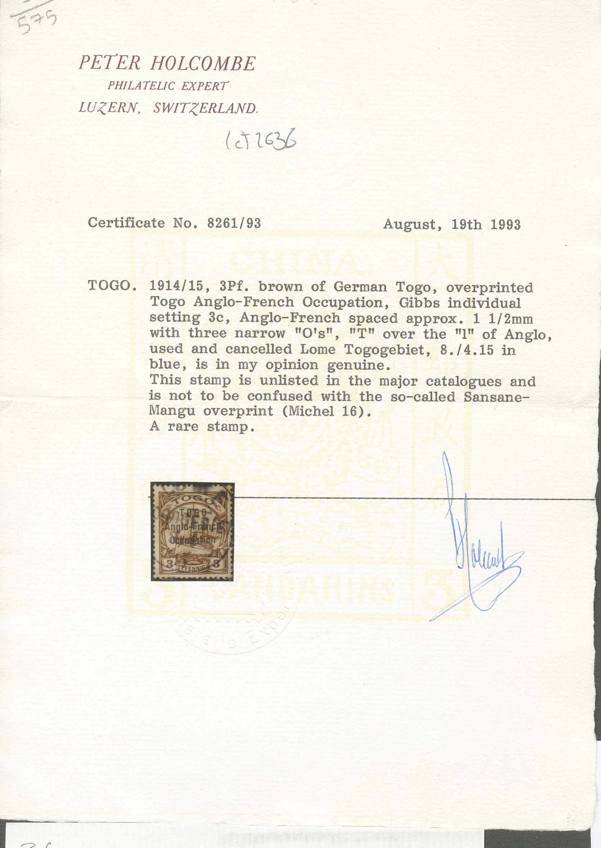TOGO. No 54, obl cad Lomé 8.4.15, froissure diagonale mais superbe d'aspect. - R (certificat Holcombe) (cote Yvert : 6750€) (Image) (Image2)