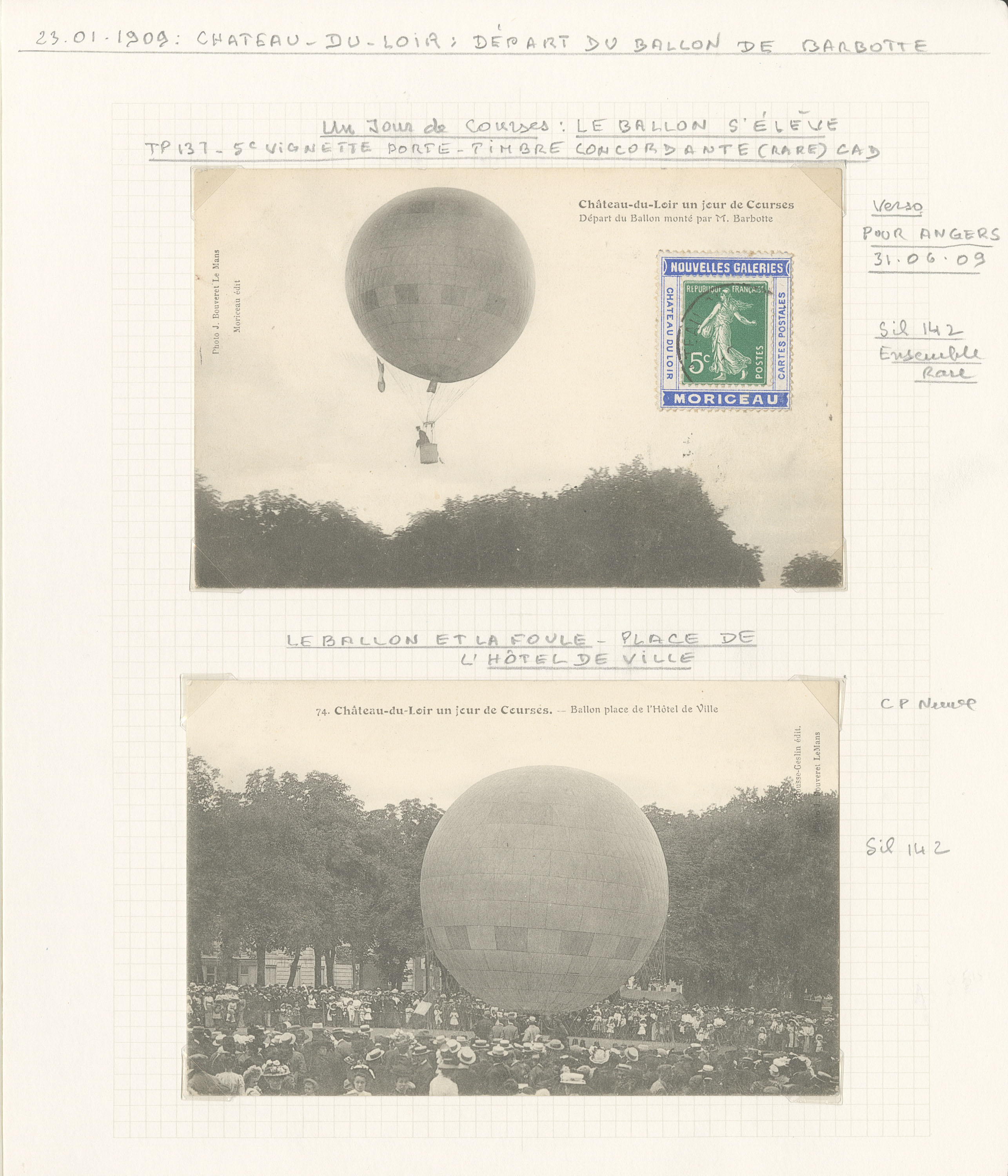 2771 c imagePOSTE AERIENNE. BALLONS. Lettre. Château du Loir un jour de Courses, 23 Janv 1909. Sil. 142. 2 CP dont une avec porte-timbres et poste 137. - TB (Image)