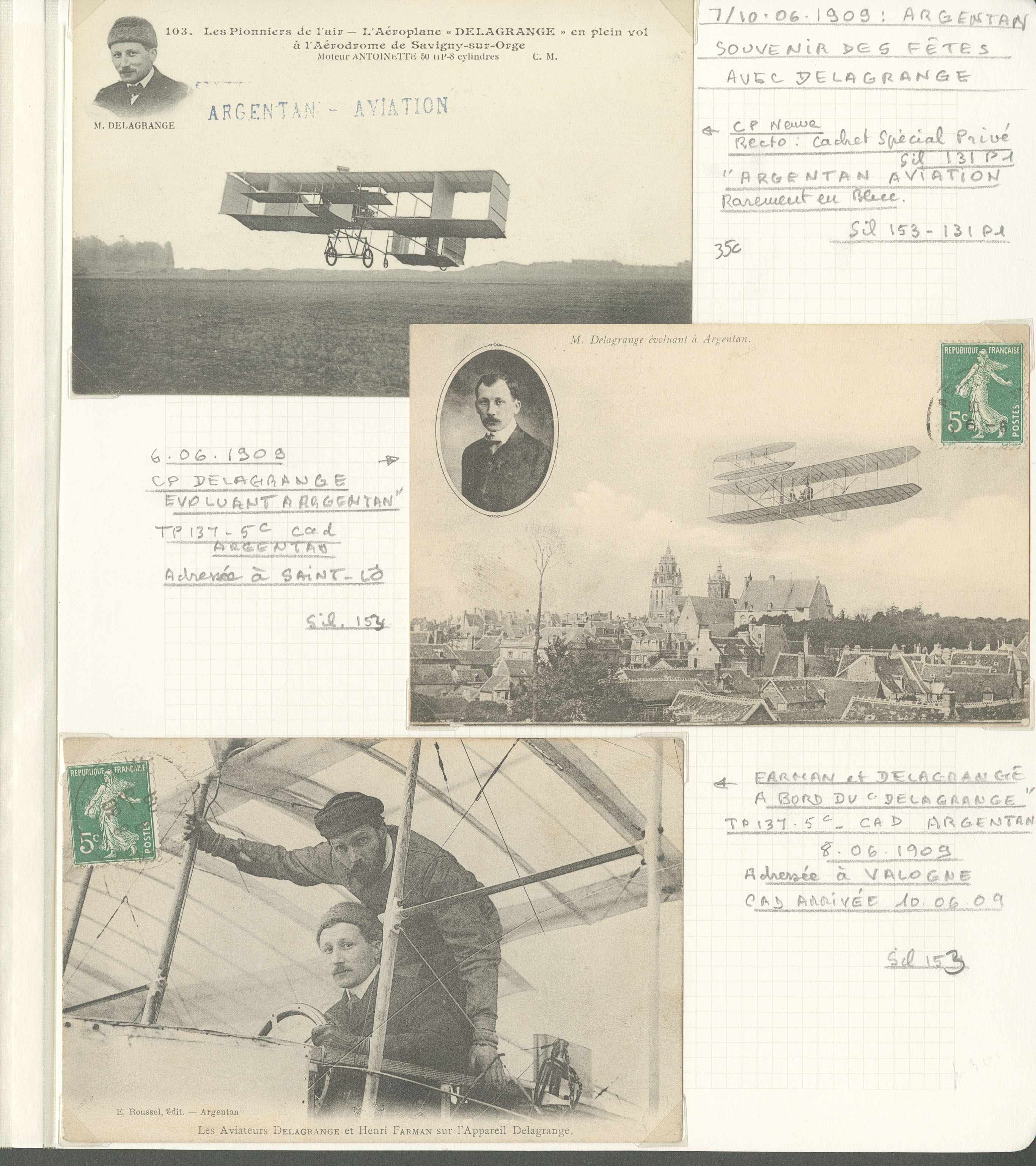 2775 c imagePOSTE AERIENNE. MEETINGS. Lettre. Argentan 7-10 Juin 1909. Sil. 153, 3 CP (dont 1 neuve) Delagrange. - TB (Image)