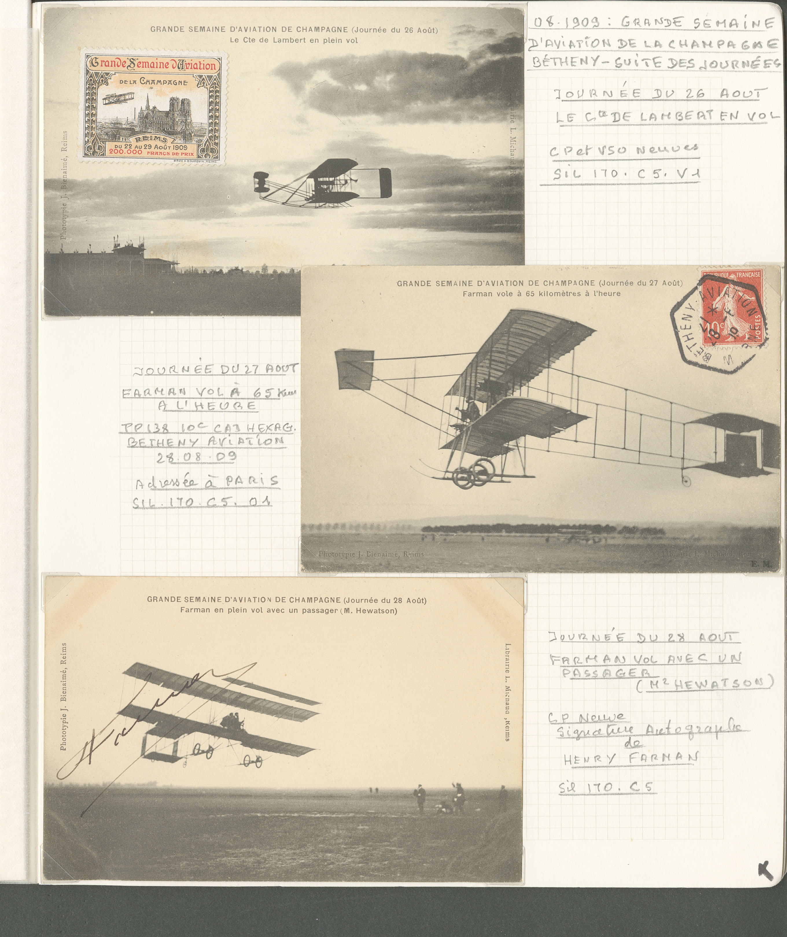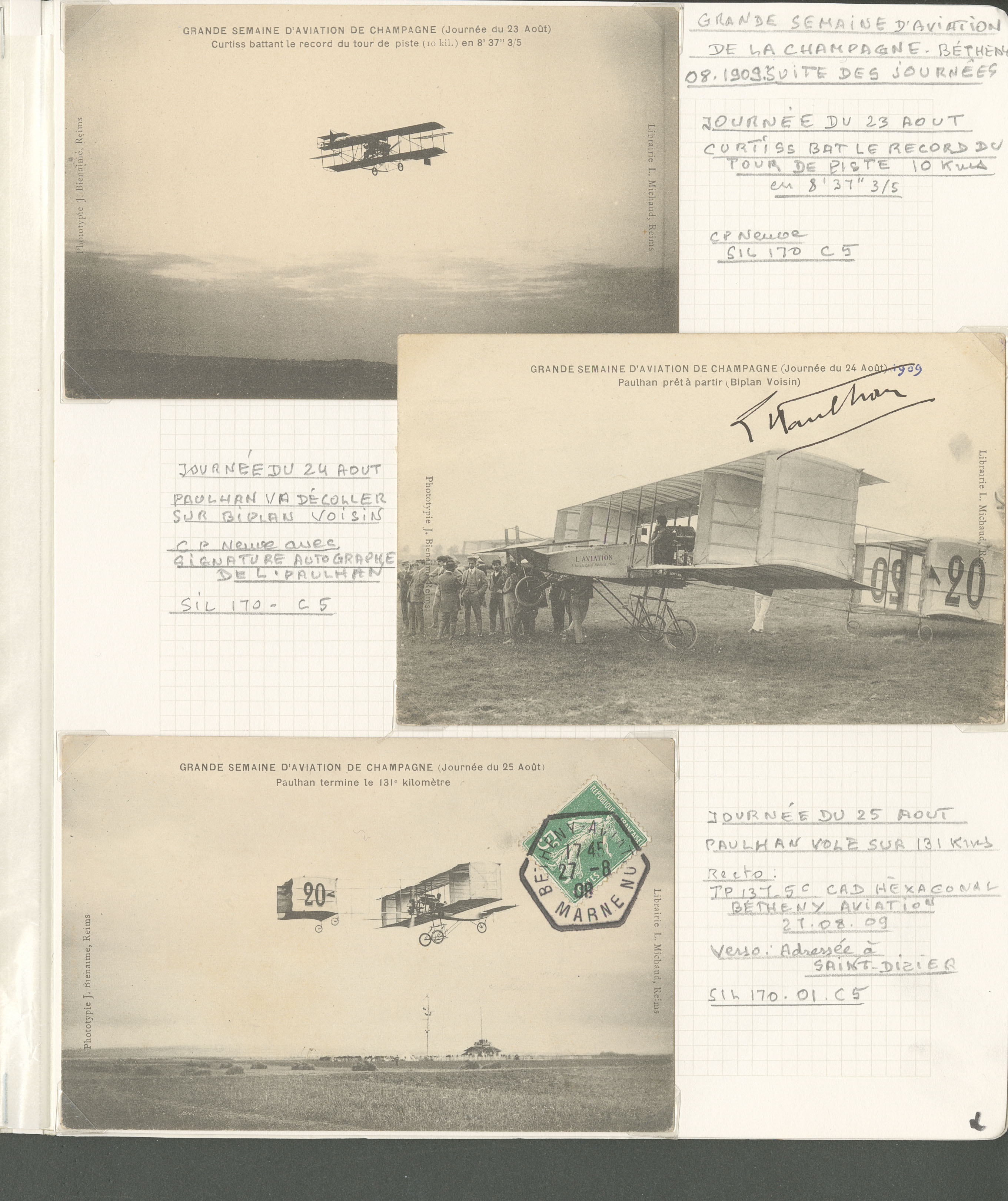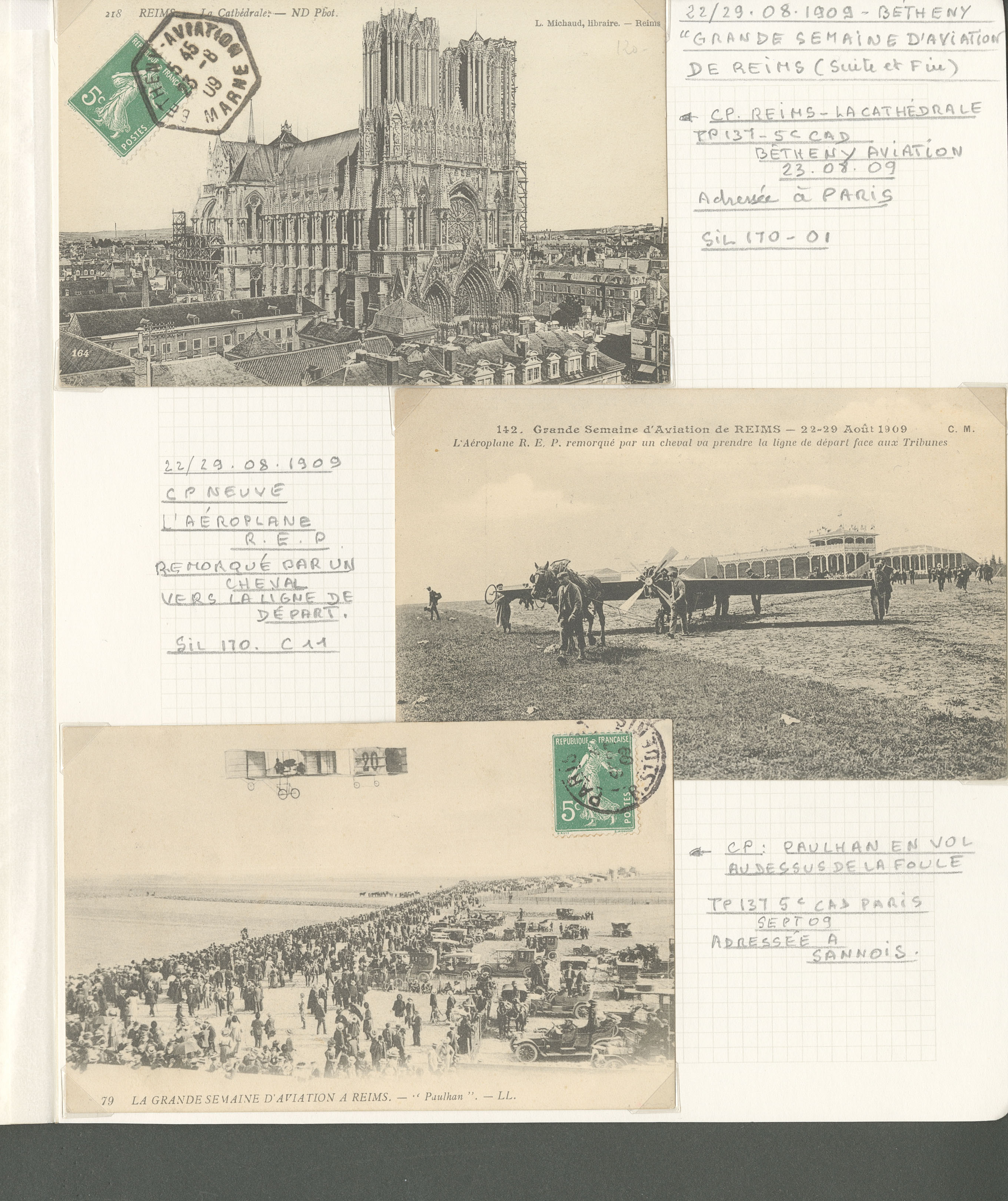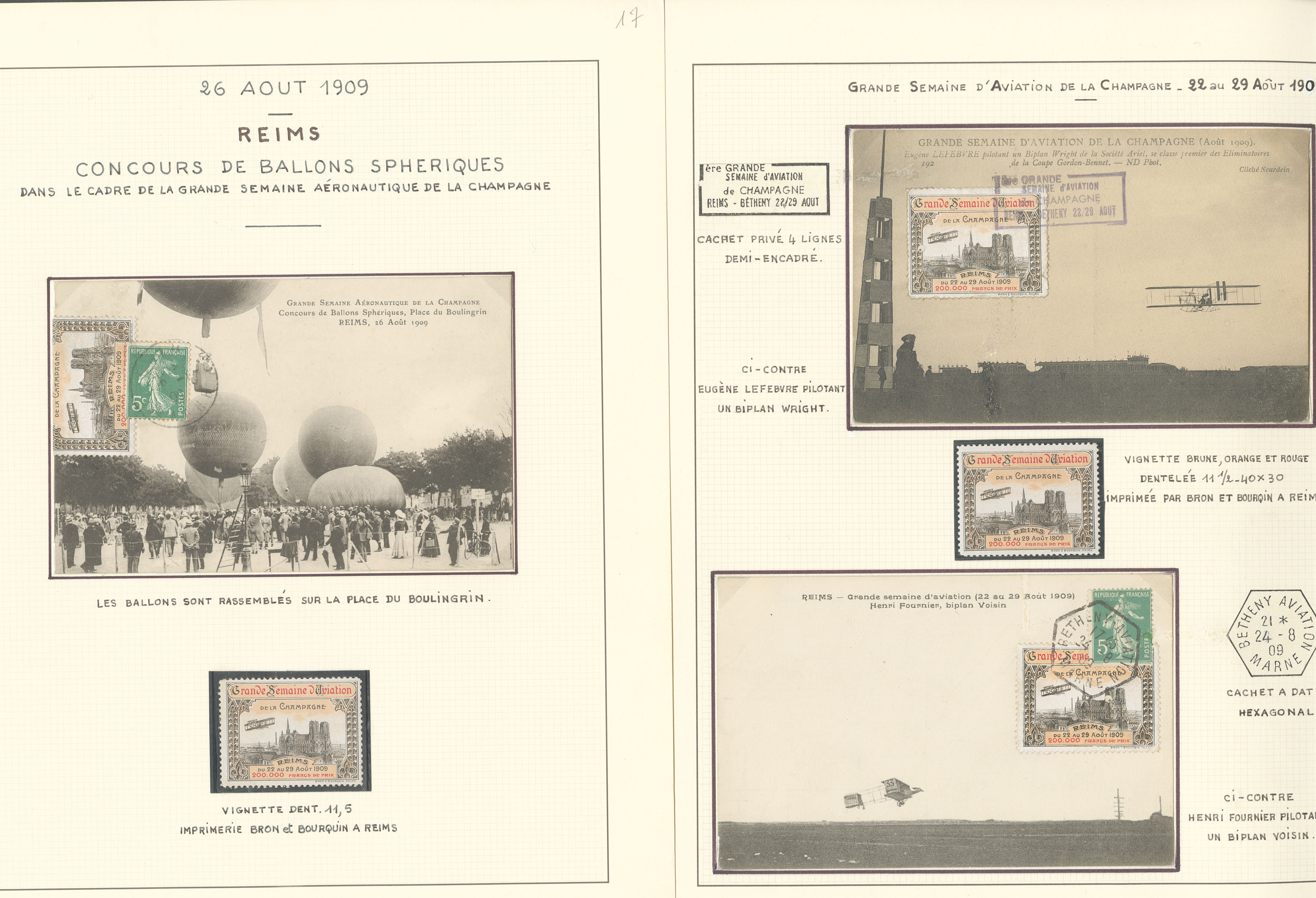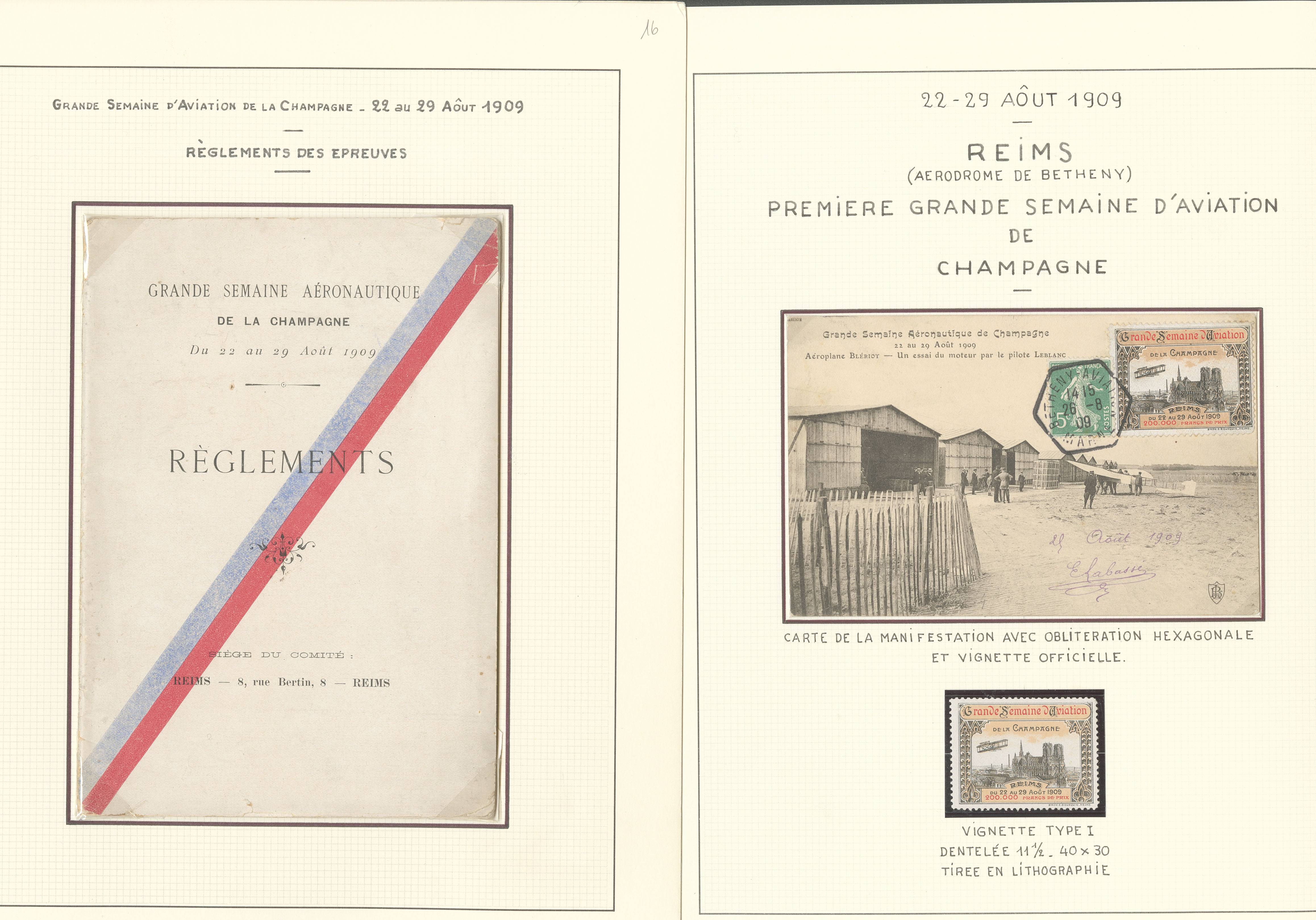 2776 c imagePOSTE AERIENNE. MEETINGS. Lettre. Grande semaine d'aviation de la Champagne 22-29 août 1909. Ensemble de 11 CP majorité obl, 1 programme officiel et le règlement, cachets, OS, affts et VS divers. - TB (Image) (Image2) (Image3) (Image4) (All Images)