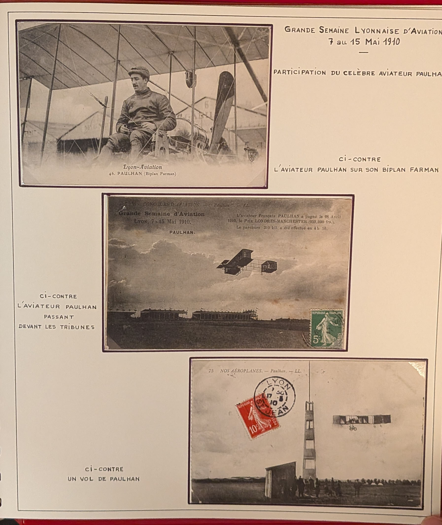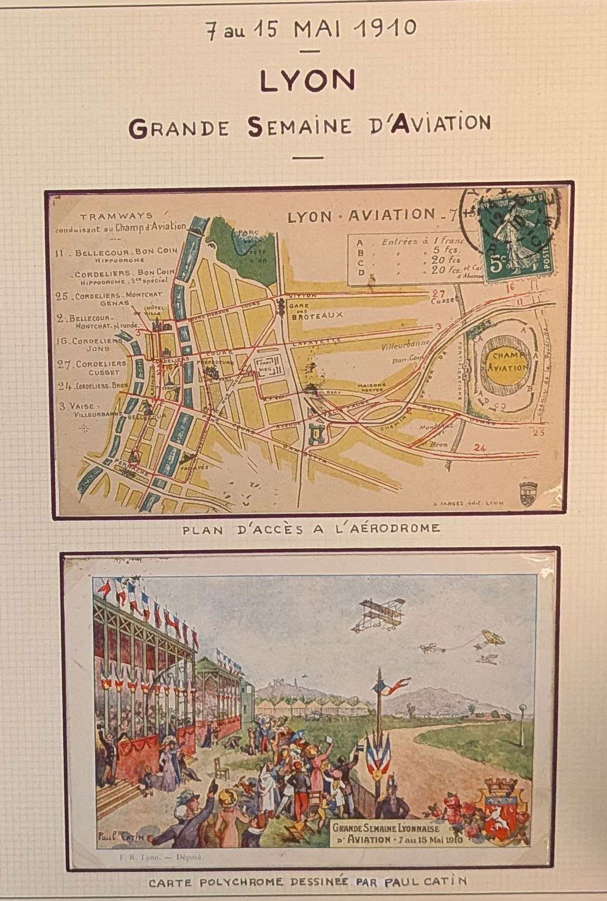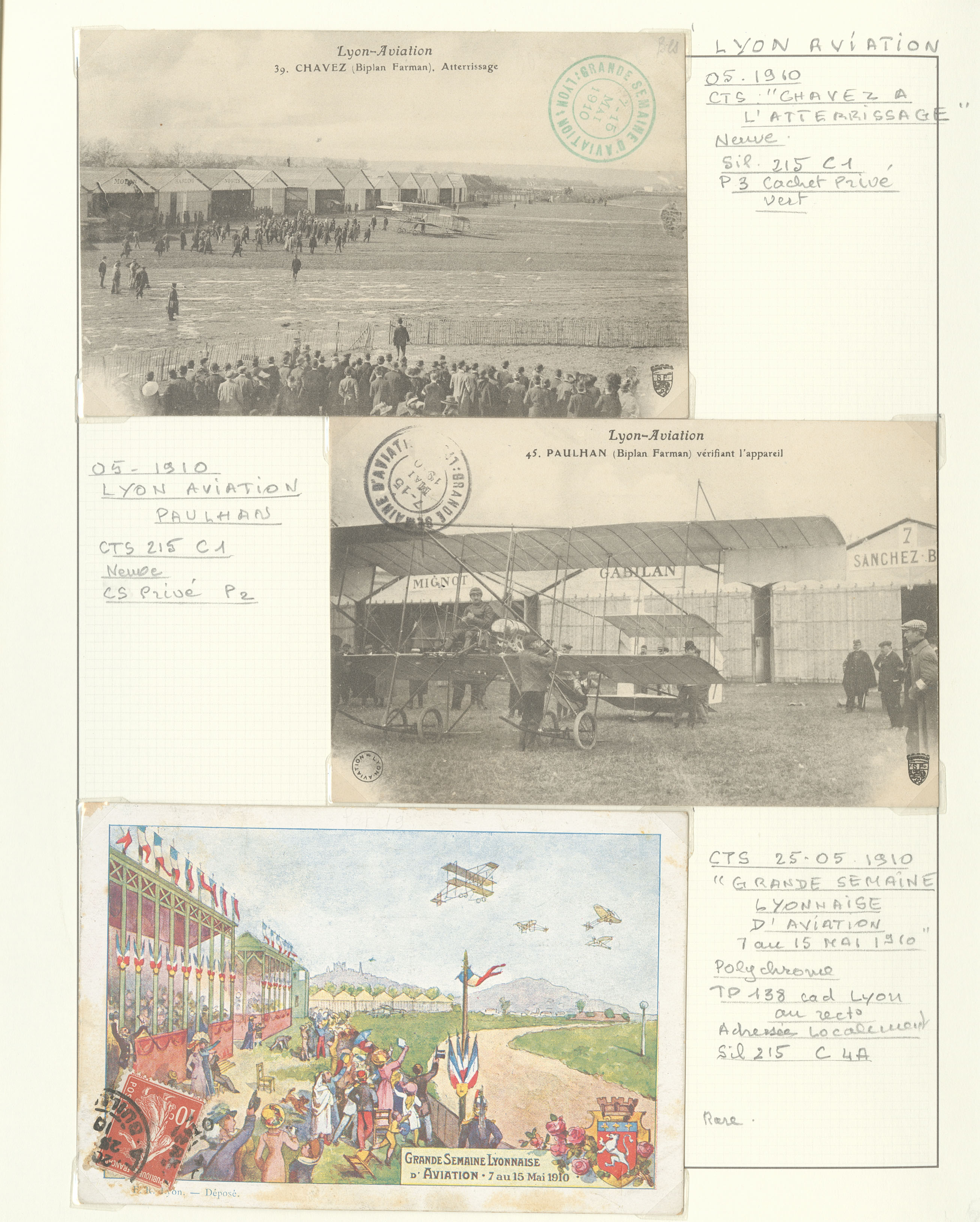 2785 c imagePOSTE AERIENNE. MEETINGS. Lettre. Semaine de l'aviation de Lyon 1910. Un programme, carte de presse, billet d'entrée et 38 CP, neuves et voyagées, cachet, obl et VS diverses, en 1 album. - TB (Image) (Image2) (Image3) (Image4) (Image5) (All Images)