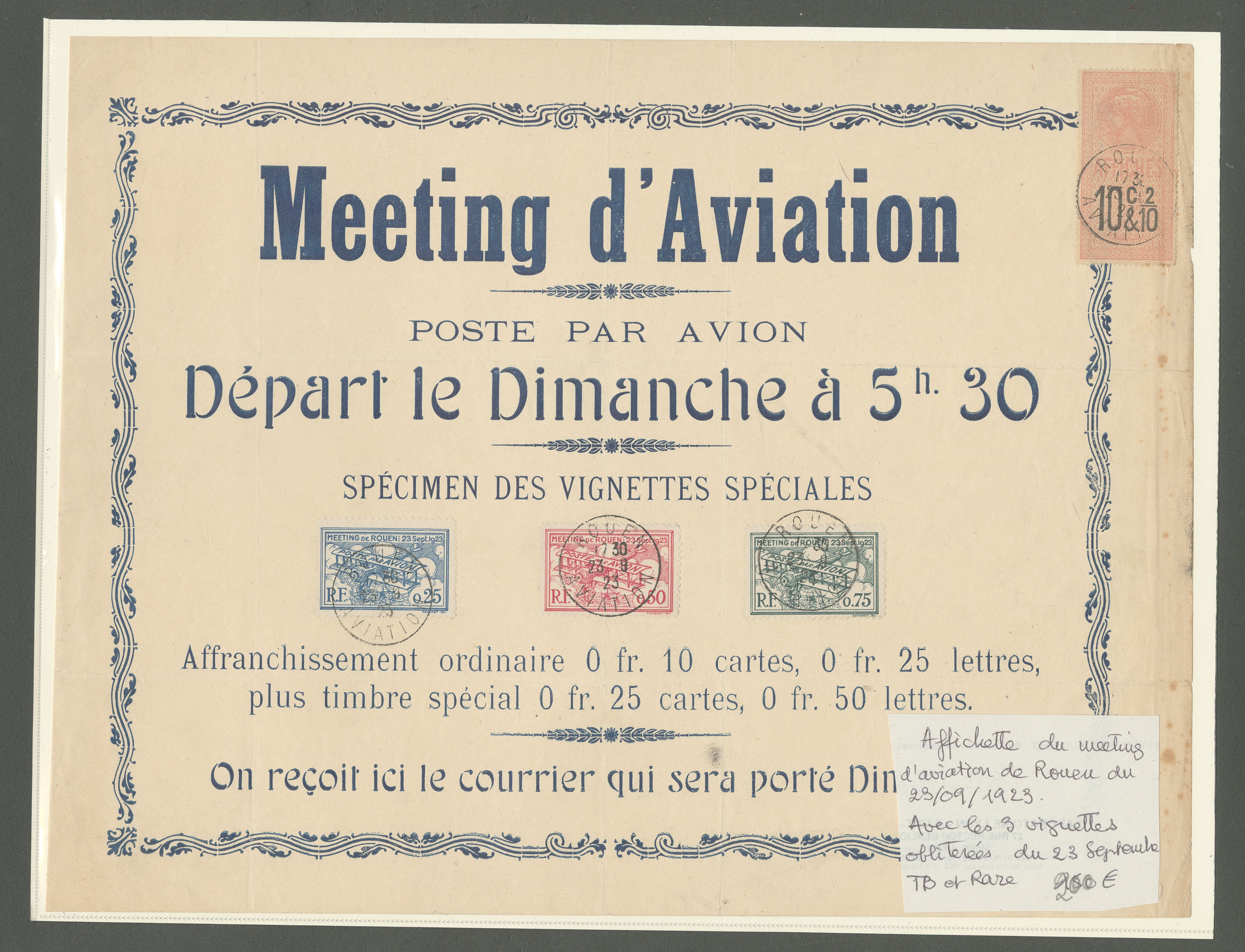 2829 c imagePOSTE AERIENNE. MEETINGS. Lettre. Meeting Rouen 23 sept 1923. Affiche avec "Spécimen des vignettes spéciales" obl Rouen 23.9.23 + fiscal. - TB (Image)
