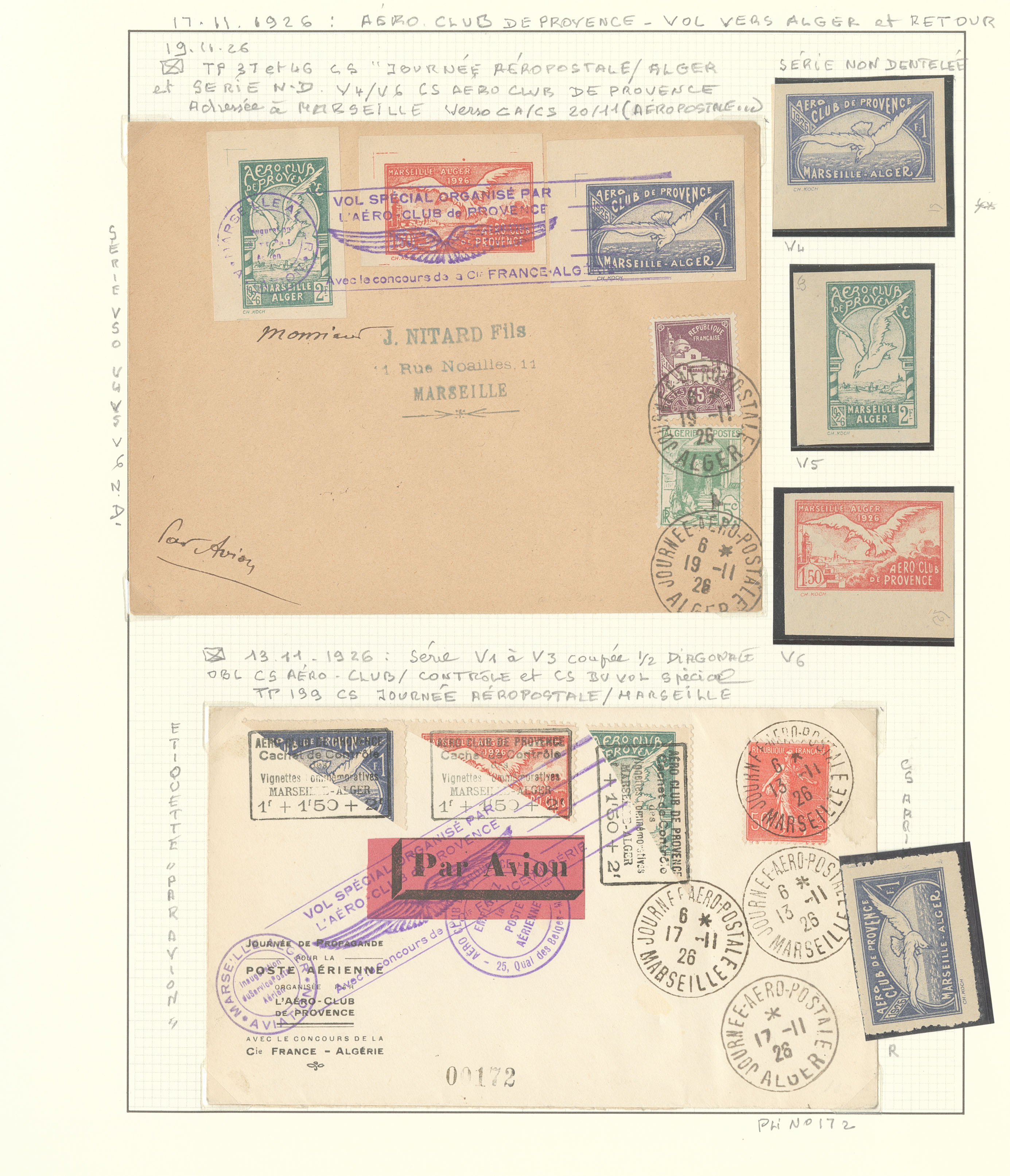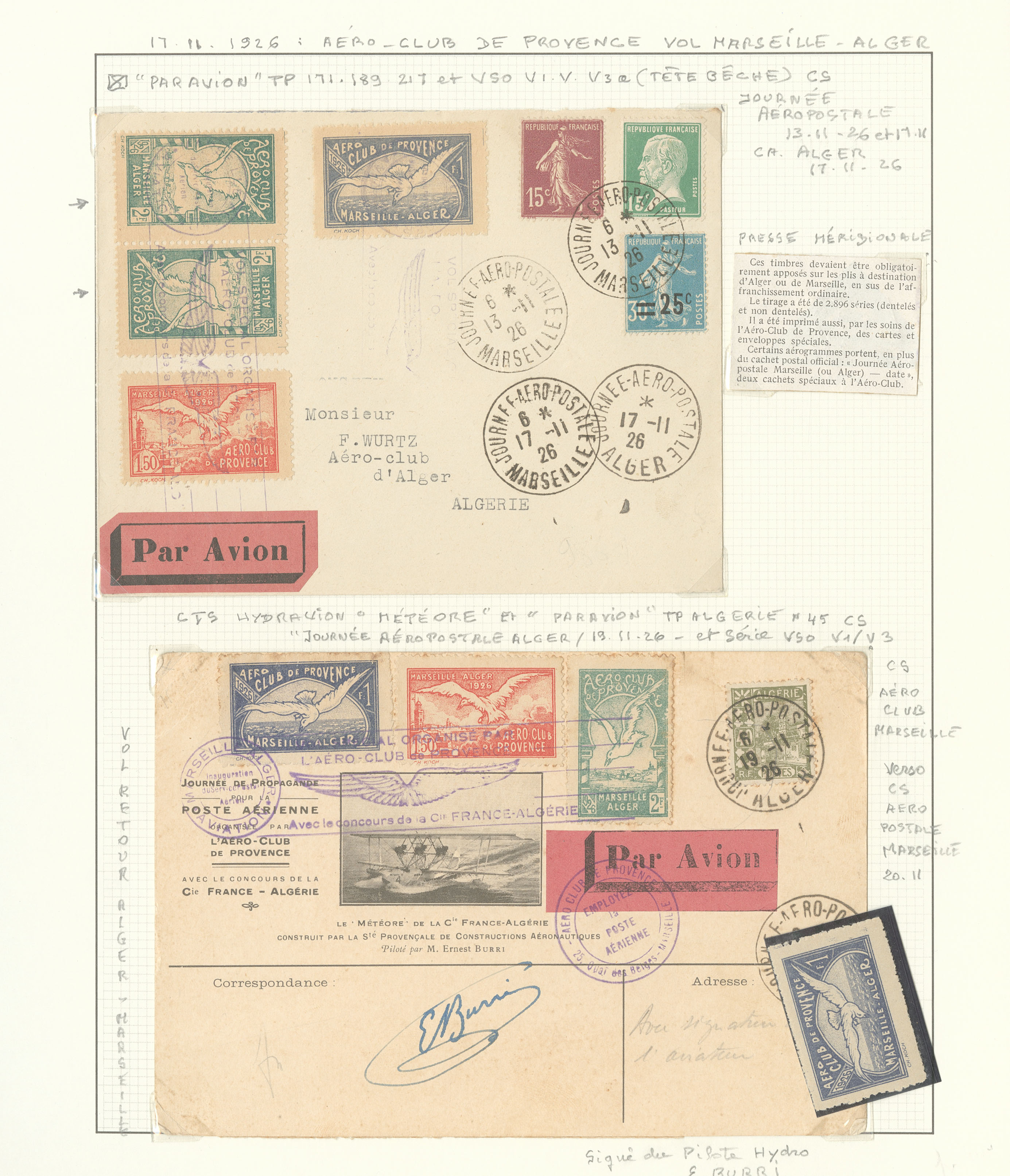 2830 nh imagePOSTE AERIENNE. MEETINGS. ** Marseille-Alger, 17 Nov 1926. Sil. 873. Ensemble de 46 VS dont bloc de huit, ND et tête-bêche, qqs ex obl et 6 enveloppe dont une signée par E. Burri. - TB (Image) (Image2) (Image3) (All Images)