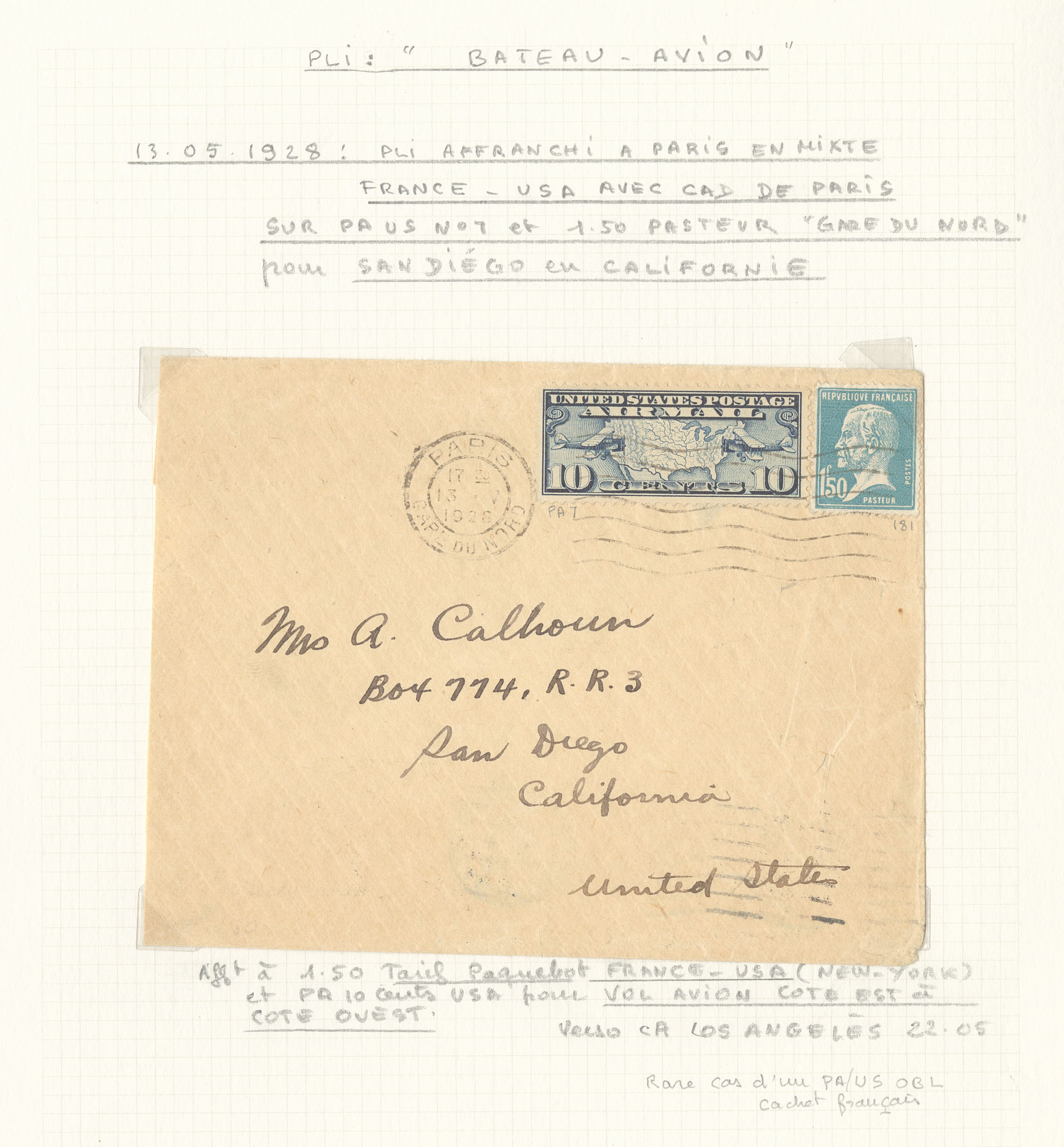 2831 c imagePOSTE AERIENNE. MEETINGS. Lettre. Bateau-avion. Enveloppe afft mixte France-USA obl cad Paris 13.V.1928, acheminée par bateau jusqu'à NY et par avion cote Est-côte Ouest, pour San Diégo, arr. Los Angeles 22.5. - TB (Image)