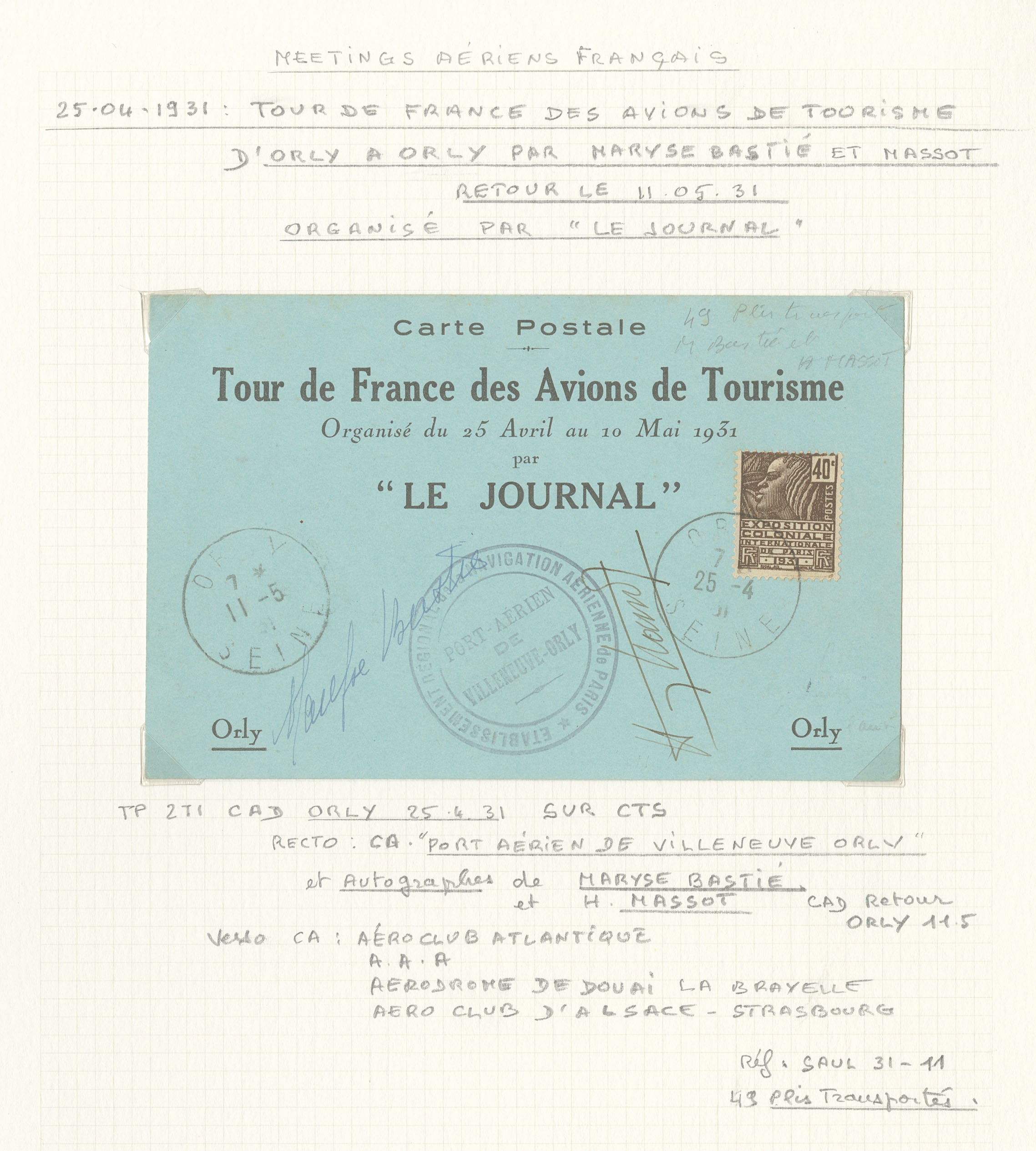 2832 c imagePOSTE AERIENNE. MEETINGS. Lettre. Tour de France des avions de tourisme, par M. Bastié et Massot, 25 Avril 31, retour le 11.5.31. CTS "Le Journal" avec CS et signatures des pilotes. - TB (180 plis) (Image)
