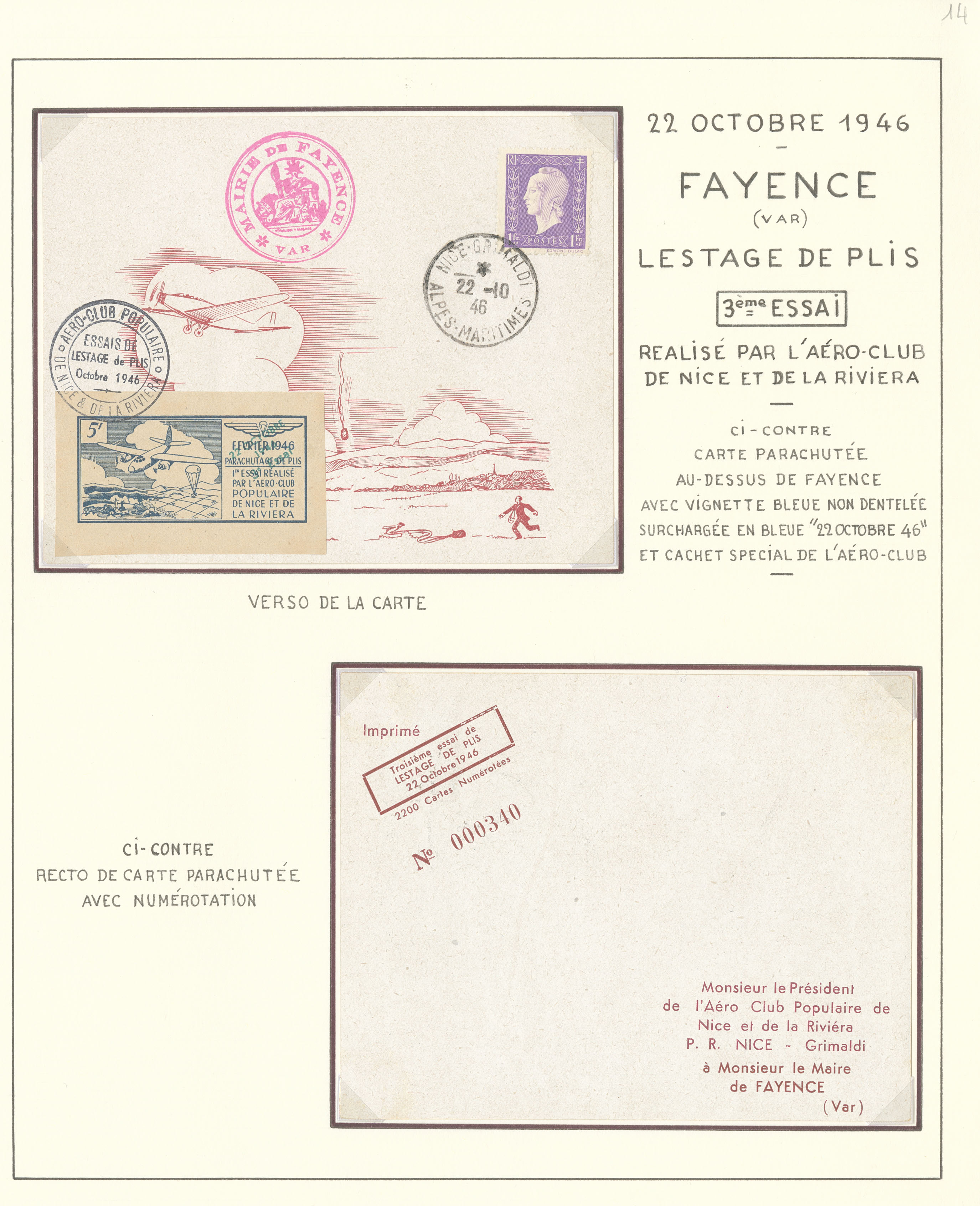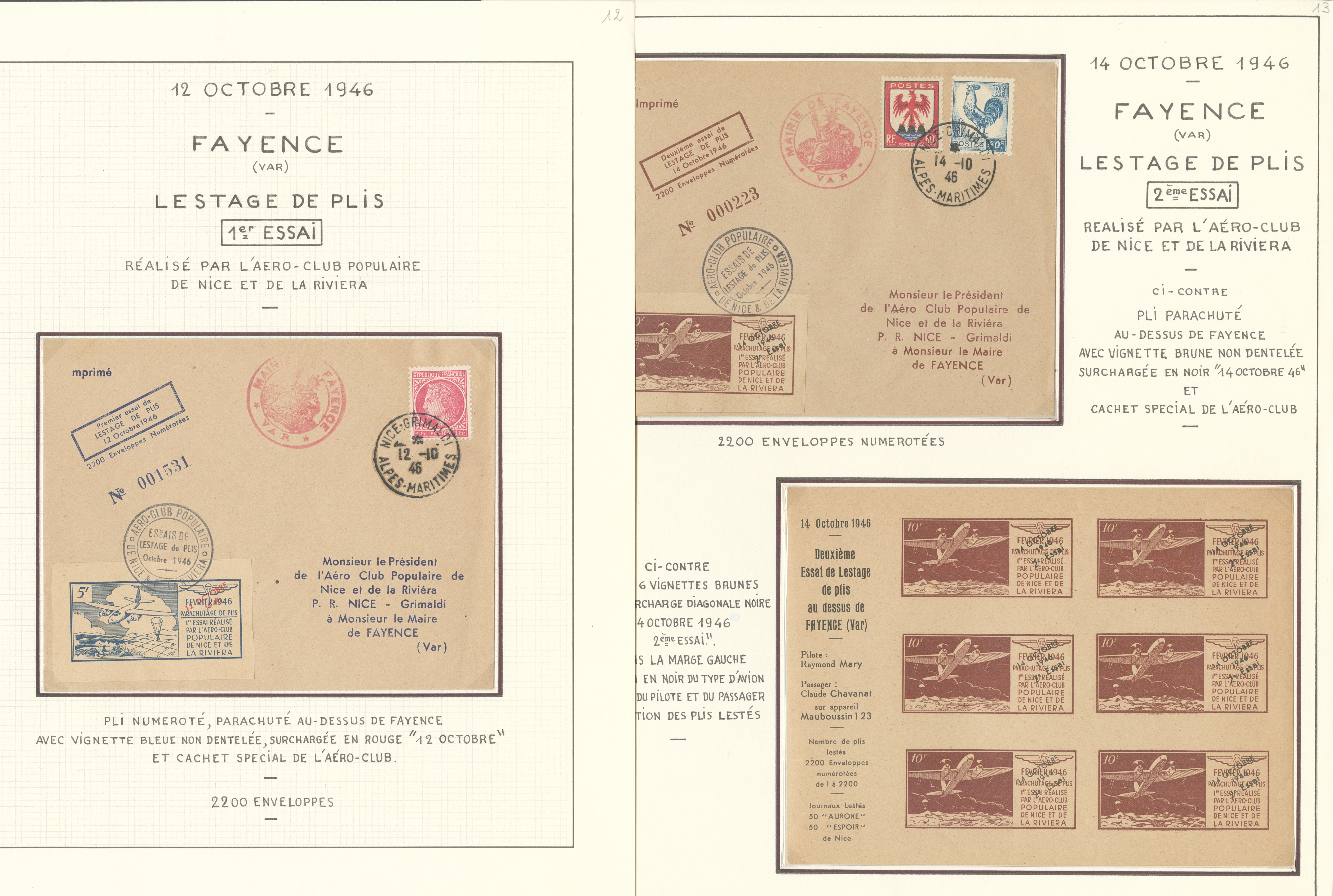 2833 c imagePOSTE AERIENNE. MEETINGS. Lettre. Fayence, essais de lestages de plis 12-22 oct 1946, 4 enveloppes affts, cachets et VS diverses dont un bloc de six . - TB (Image) (Image2) (All Images)