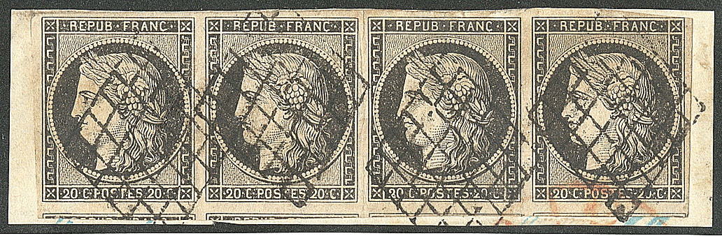 bande de quatre, 4 voisins, obl grille sur support. - TB (cote Yvert : 900€) (Image)