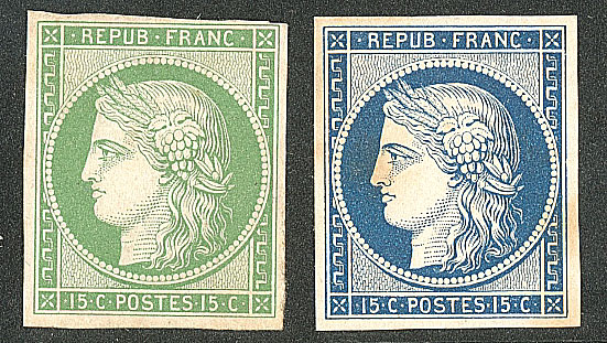 Cérès 1849. 15c vert et 15c bleu, papier carton. - TB (cote Yvert : 800€) (Image)