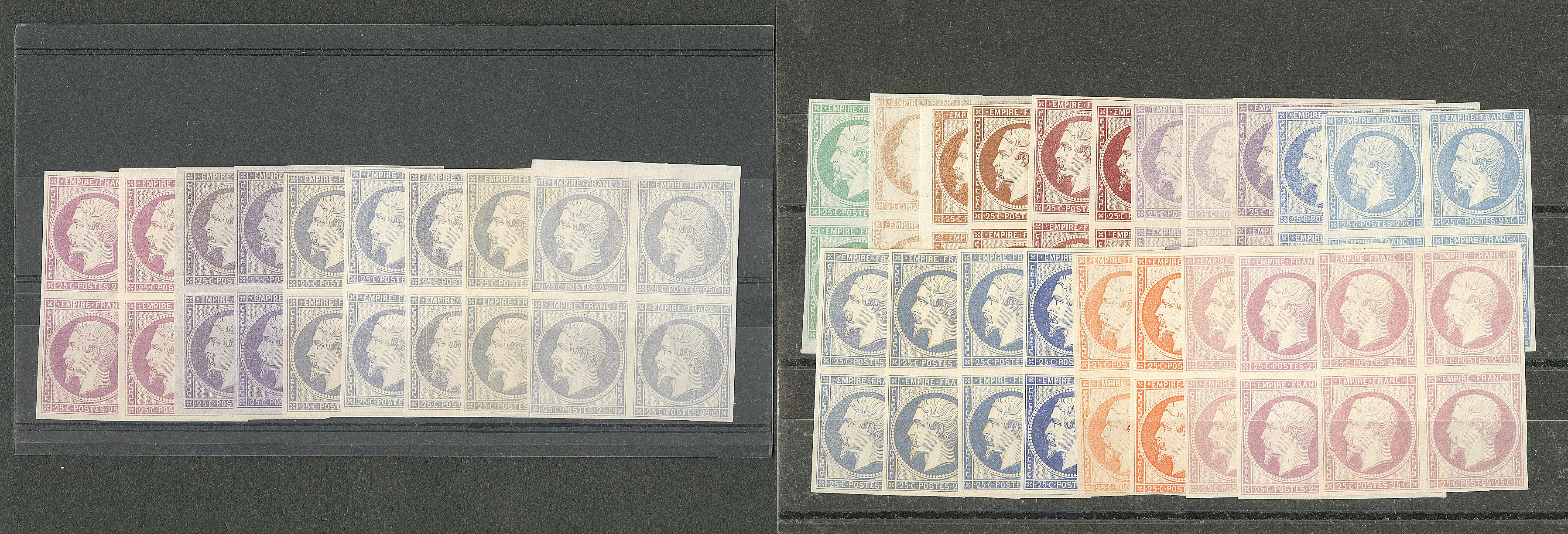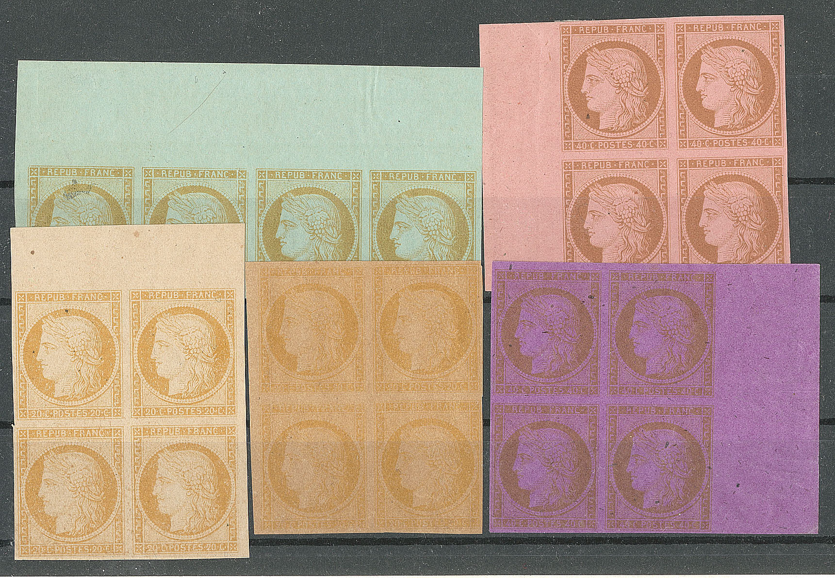 Cérès 1849. 20c (2 blocs de quatre jaune), 40c (2 blocs de quatre + bande de quatre) bdf, nuances diverses. - TB (cote Yvert : 2240€) (Image)