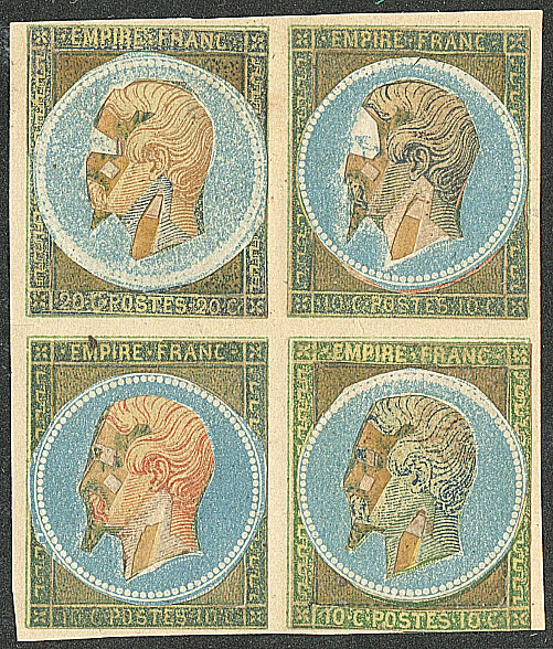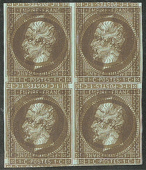 Empire. 1c mordoré, bloc de quatre, double impression dont une renversée. - TB (cote Yvert : 1200€) (Image)